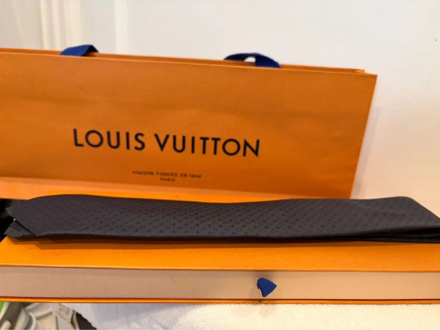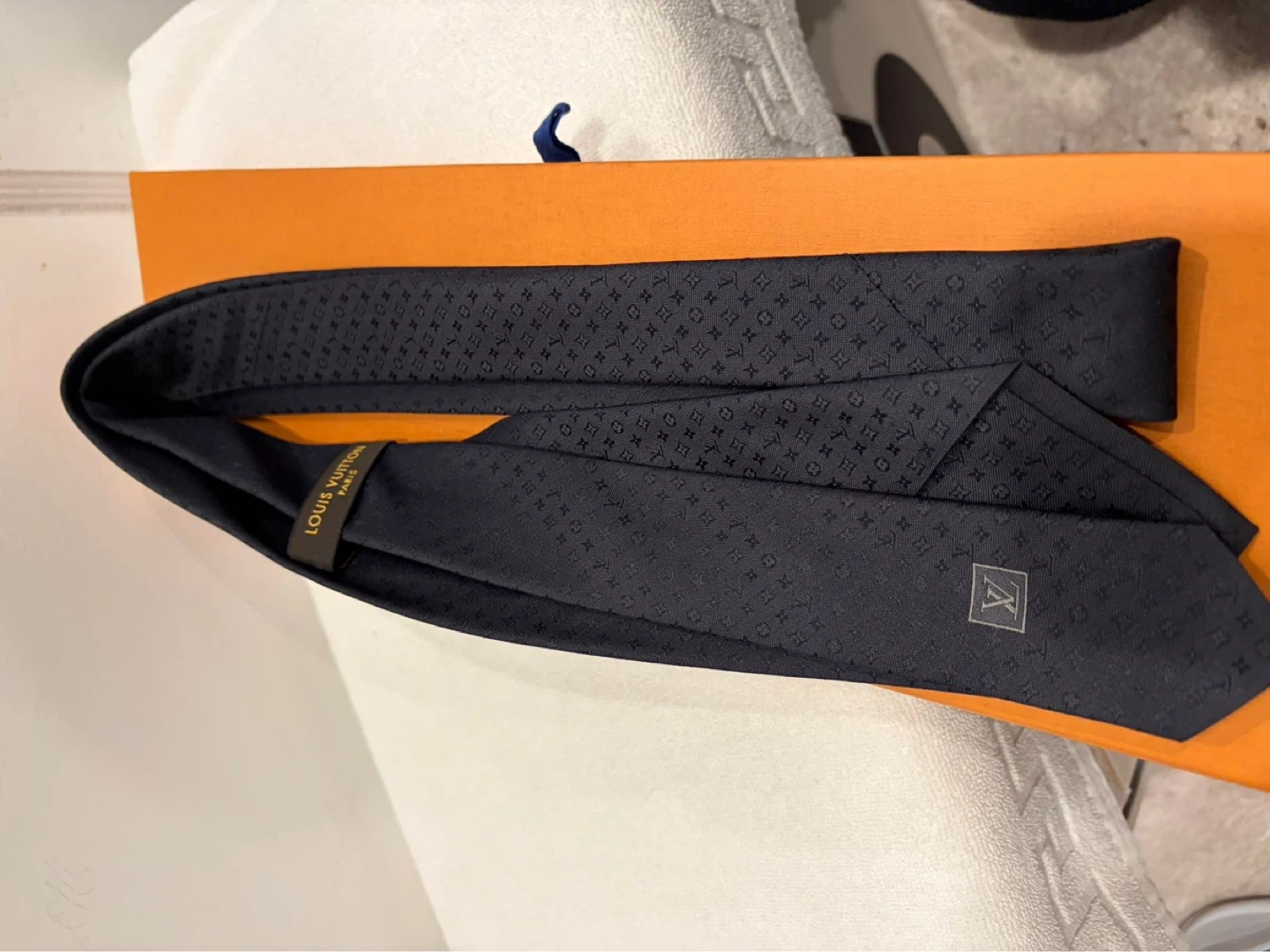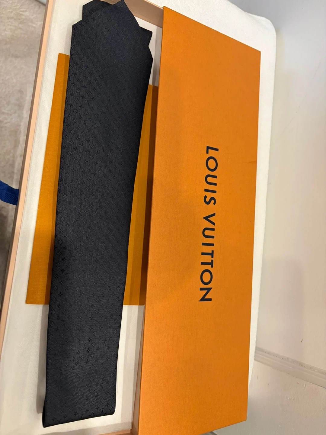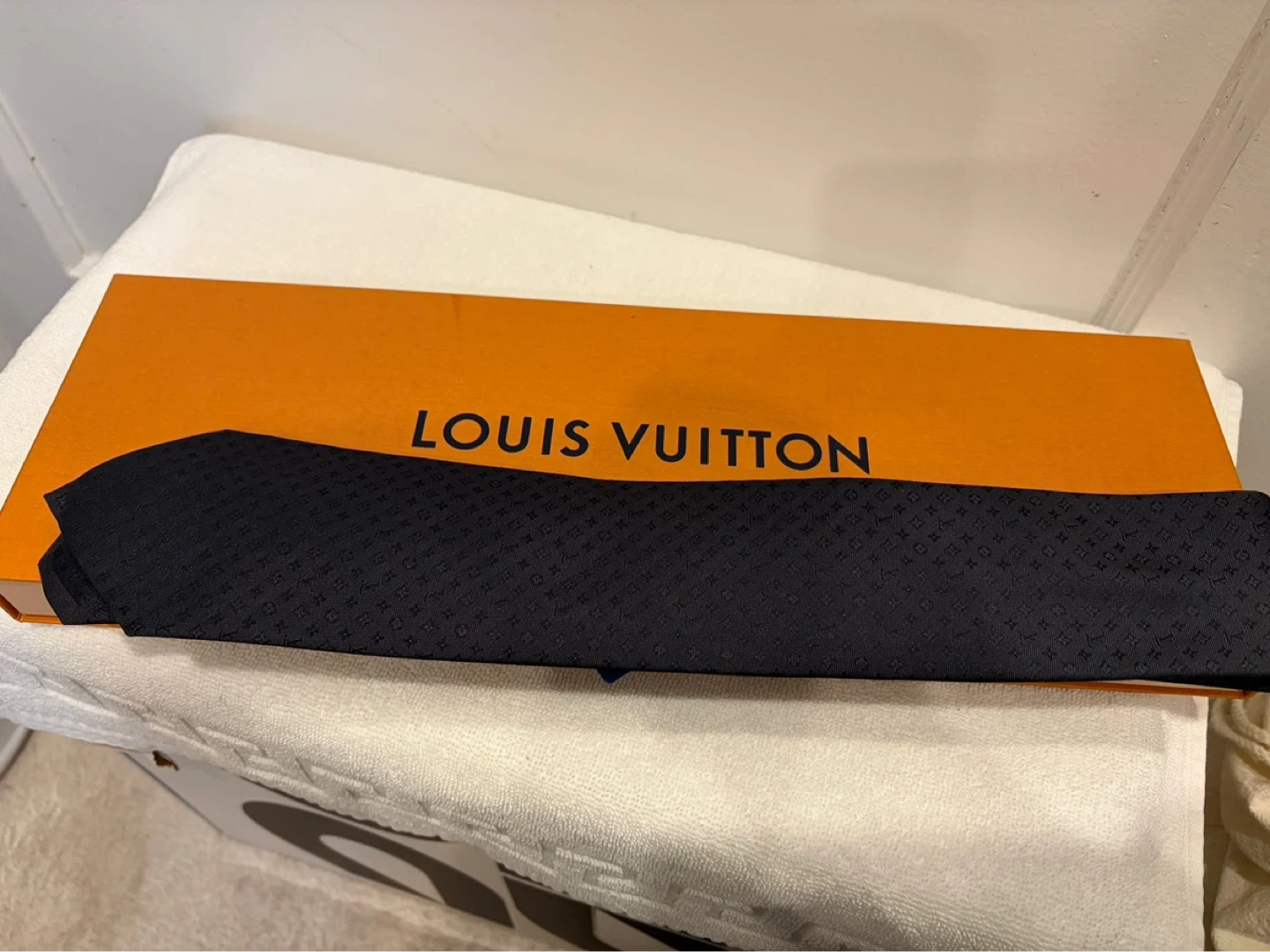 Black Louis Vuitton tie with all-over monogram pattern. Features the iconic LV logo. Includes original Louis Vuitton box and shopping bag.