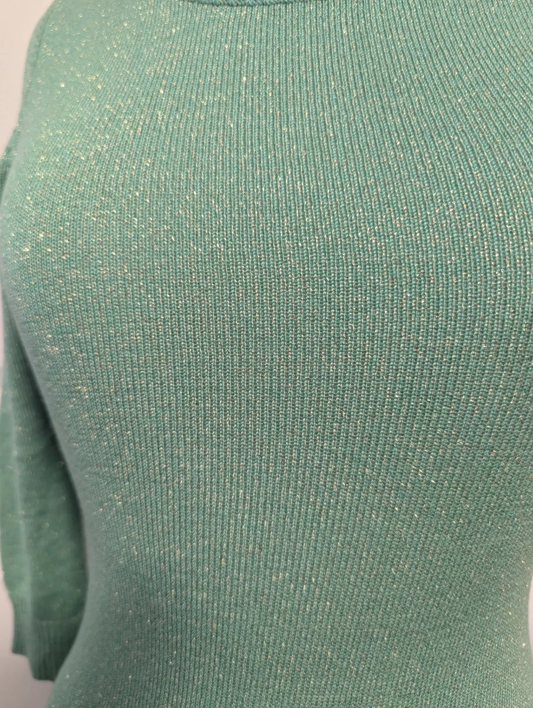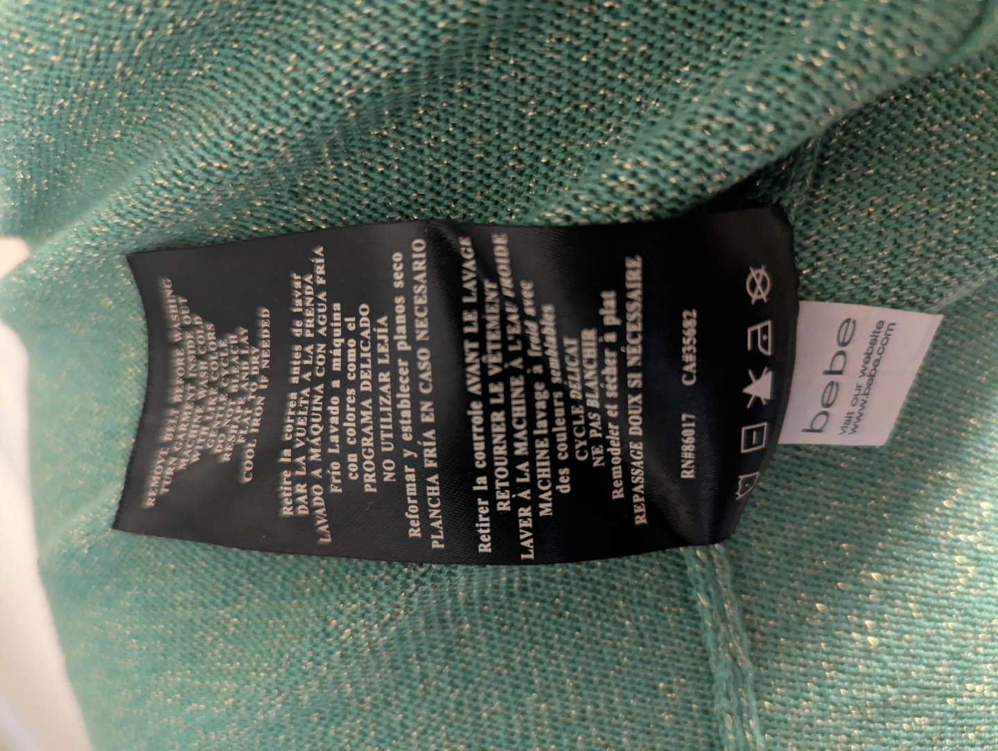 This is a women's metallic green knit sweater from Bebe. It's a size XS. The material is 88% acrylic, 9% polyester, and 3% metallic.