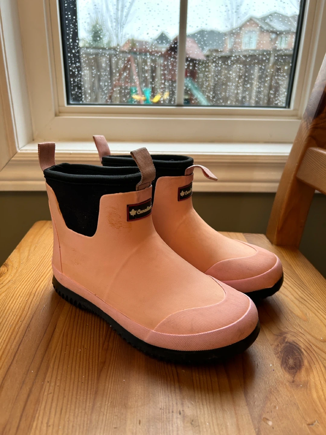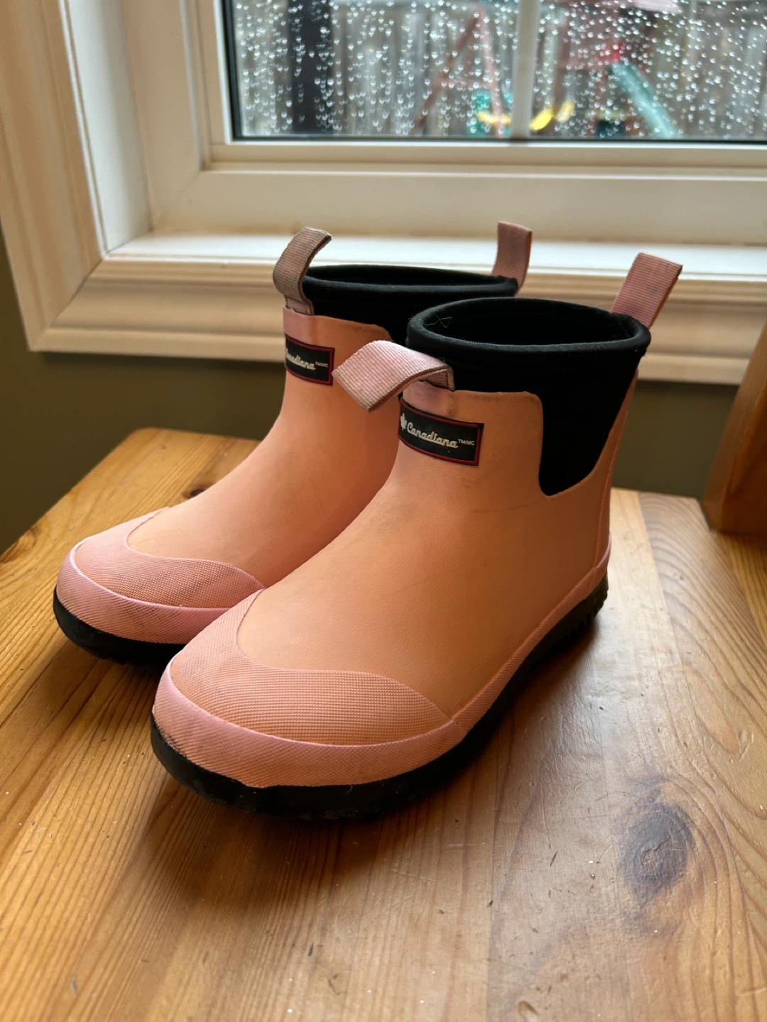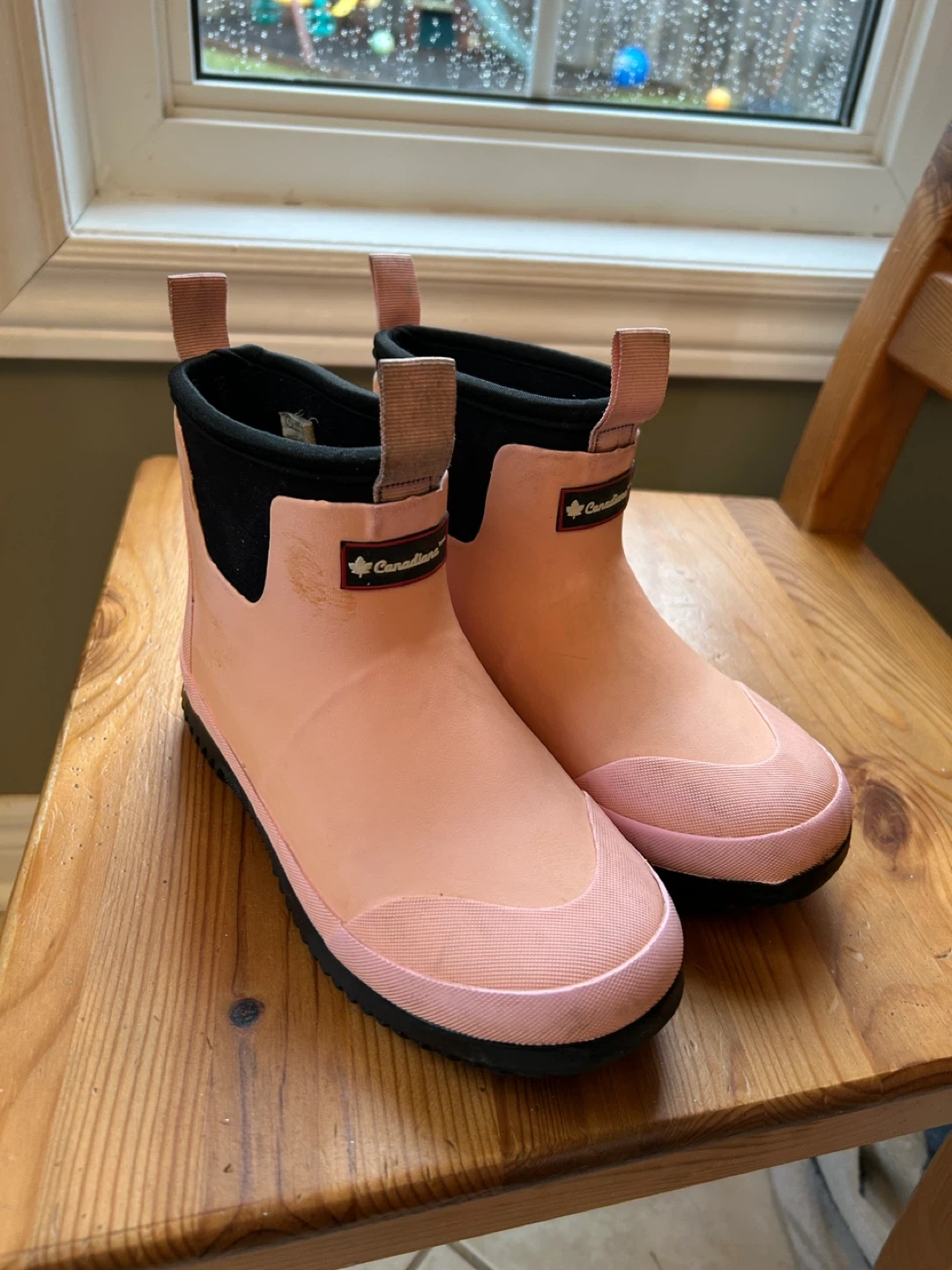 These pink rain boots are from Canadiana. They're made of waterproof rubber, perfect for wet weather. Pull-on style with handy back tabs.