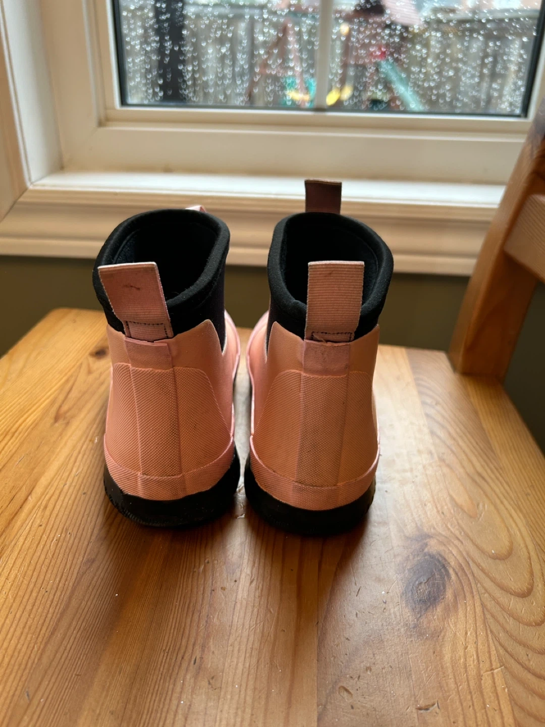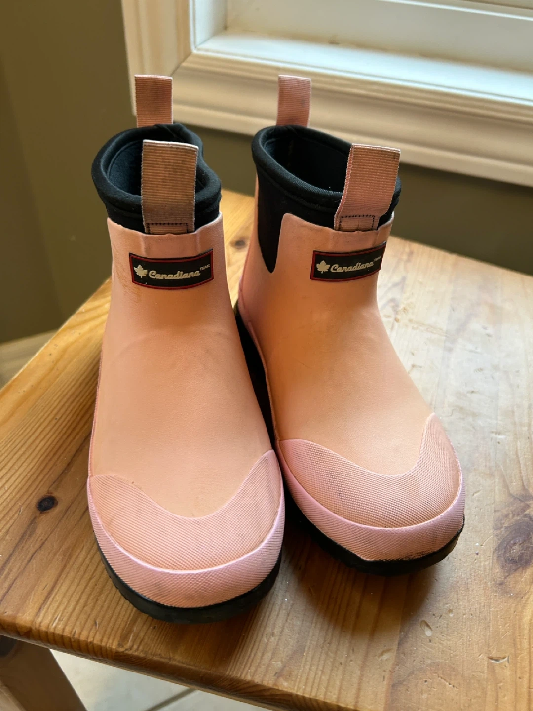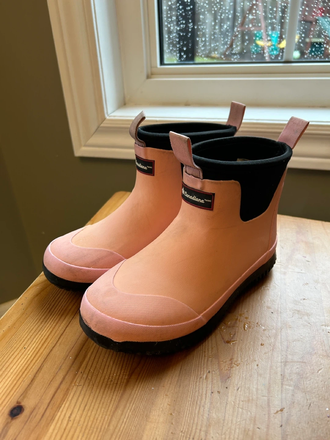 These pink rain boots are from Canadiana. They're made of waterproof rubber, perfect for wet weather. Pull-on style with handy back tabs.