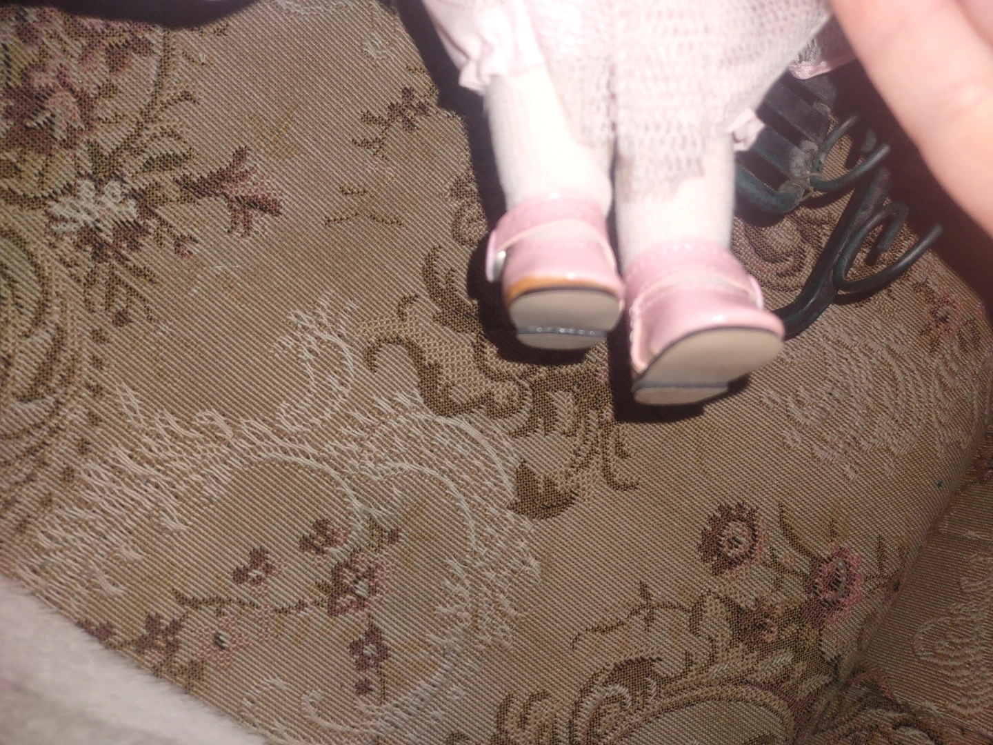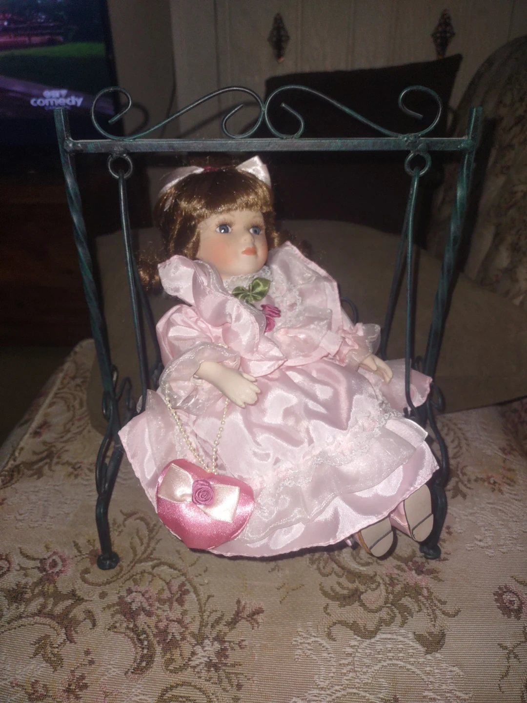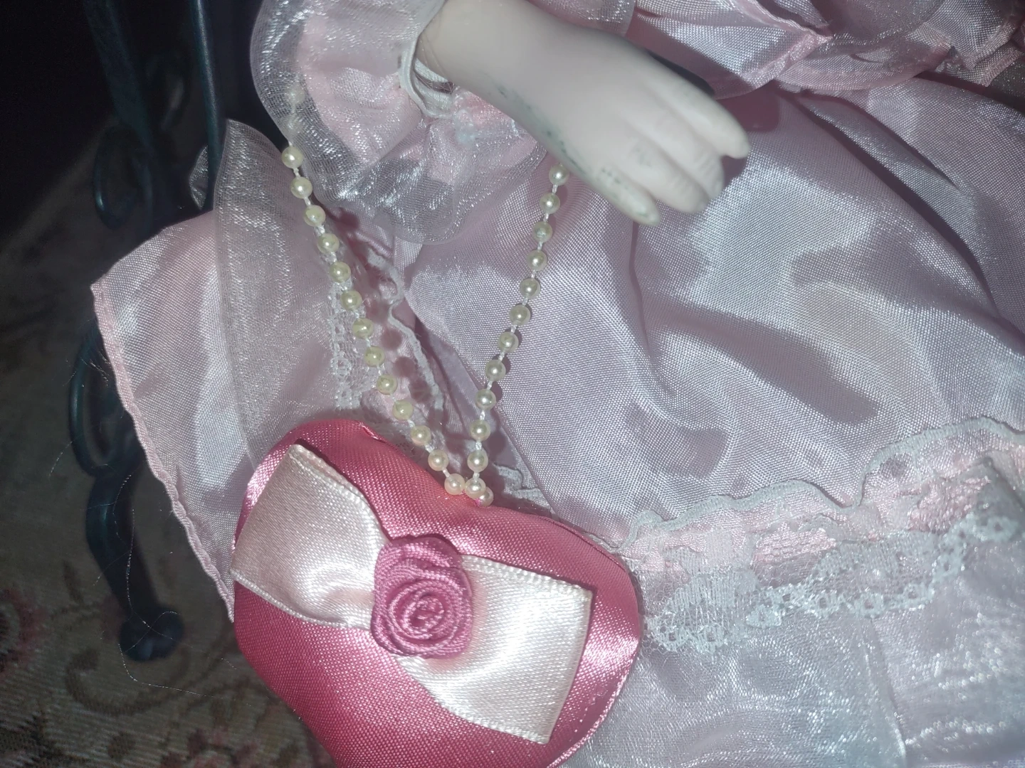 This is a lovely porcelain doll dressed in an ornate pink satin gown with lace trim. She's accessorized with a pearl necklace and a heart-shaped purse. It's a charming decorative piece!
