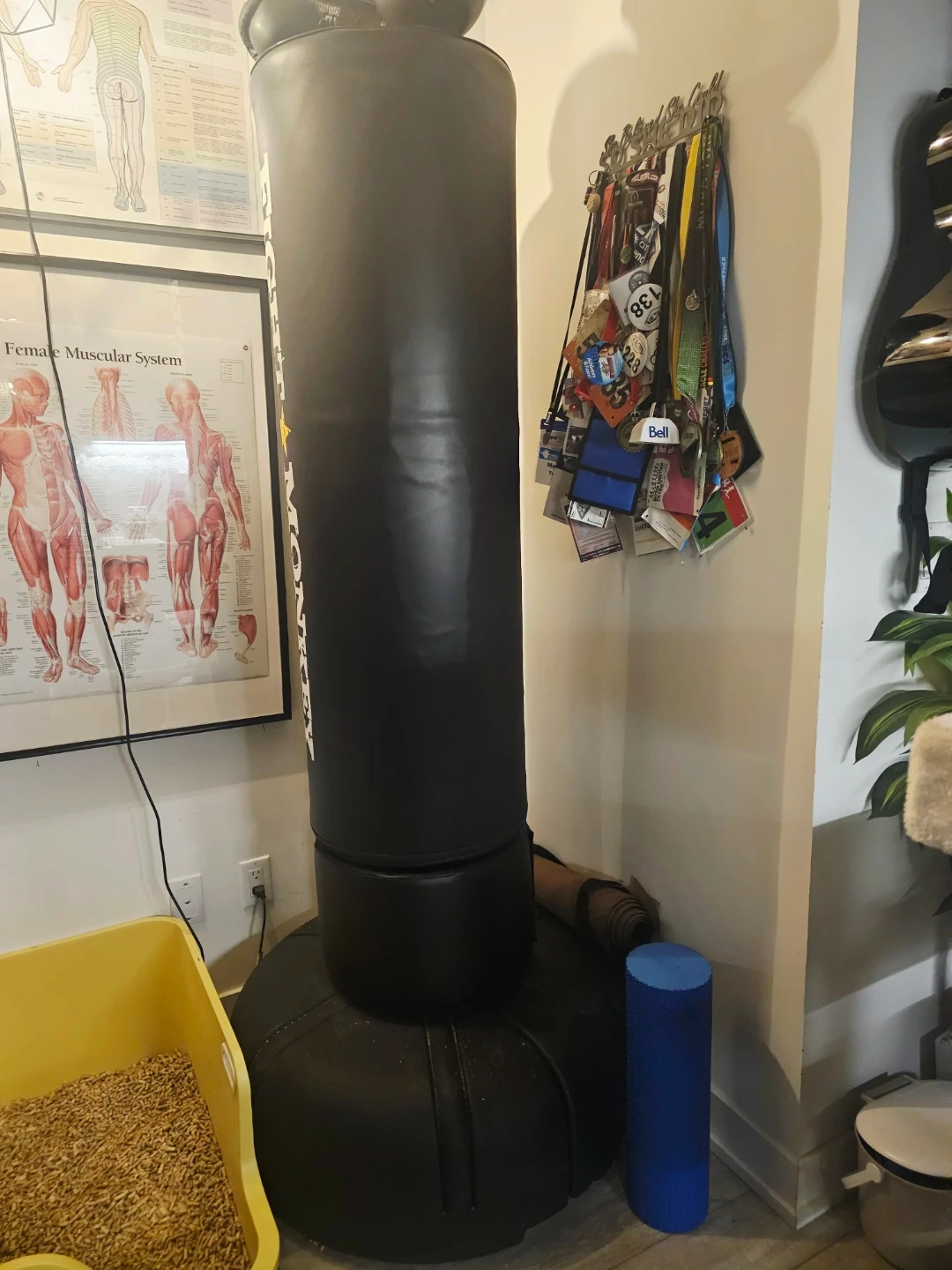 This is a free-standing punching bag for home use. It's black and has a durable exterior. Its stable base makes it easy to set up and use. This bag is great for boxing/kickboxing training and fitness routines!