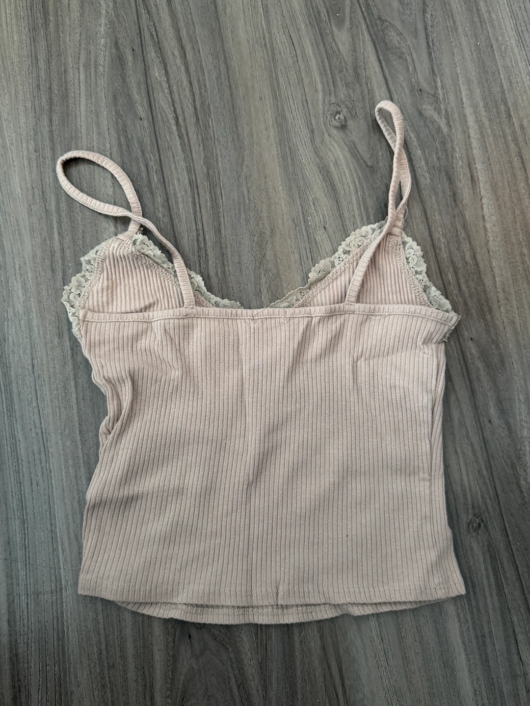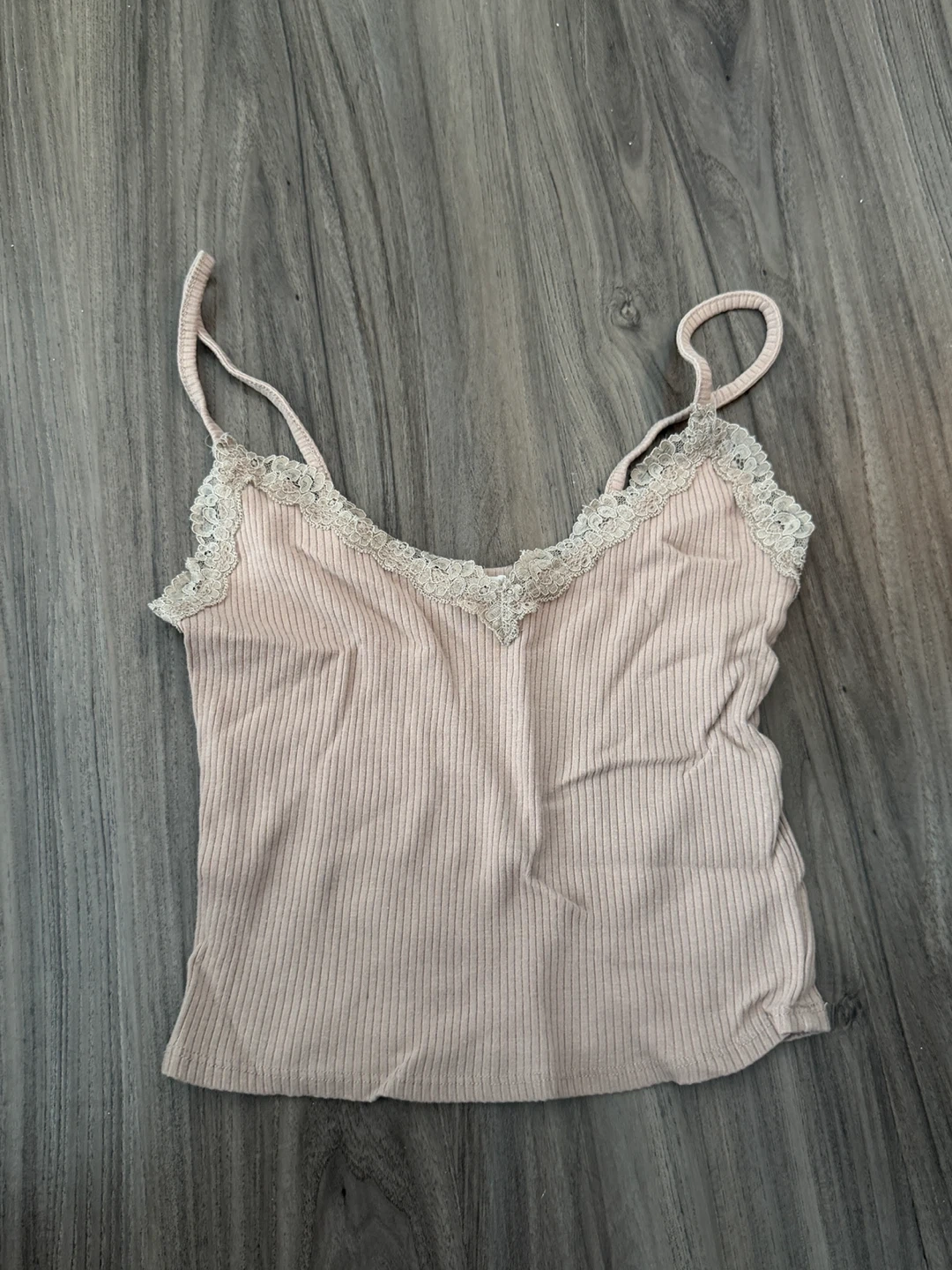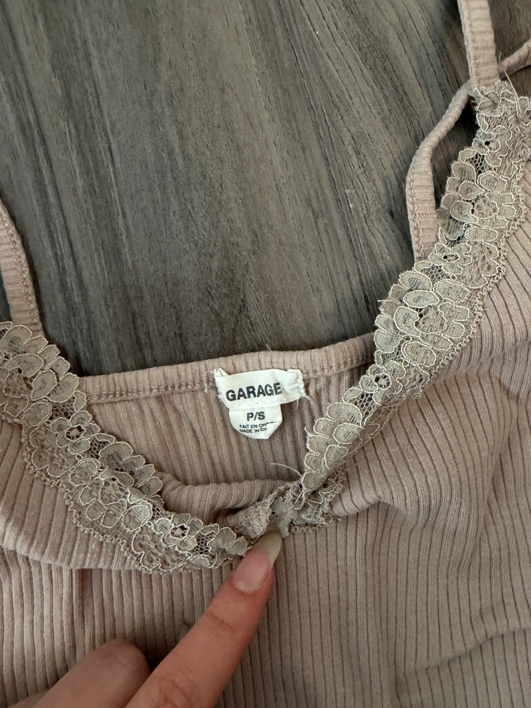 This is a light pink ribbed cami top from Garage with delicate lace trim. It's a size P/S. It's made of a comfortable fabric blend.
