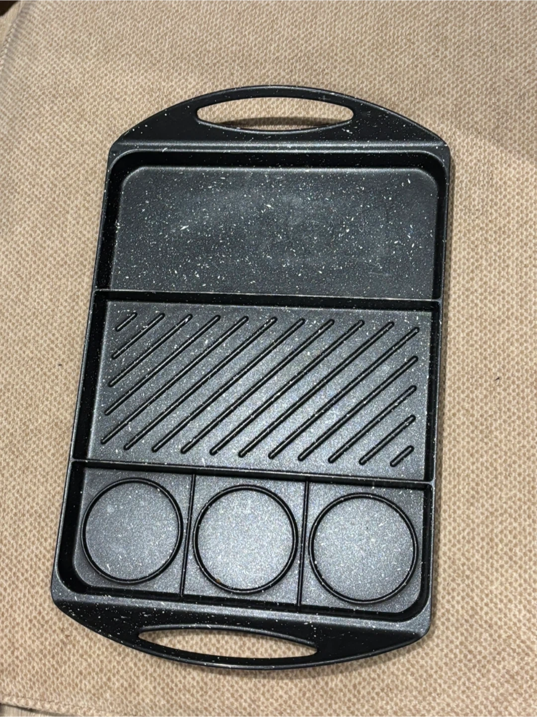 This black griddle pan features a ribbed grilling surface and three round indentations for cups. It's made of a durable, speckled material. Perfect for cooking breakfast items or small snacks!