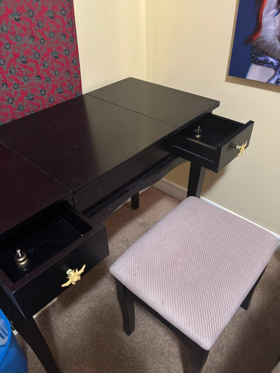 A dark vanity desk with a lift-top mirror and a matching upholstered stool. It has two drawers with decorative gold pulls. Ample storage space inside the desk and drawers for makeup and accessories.