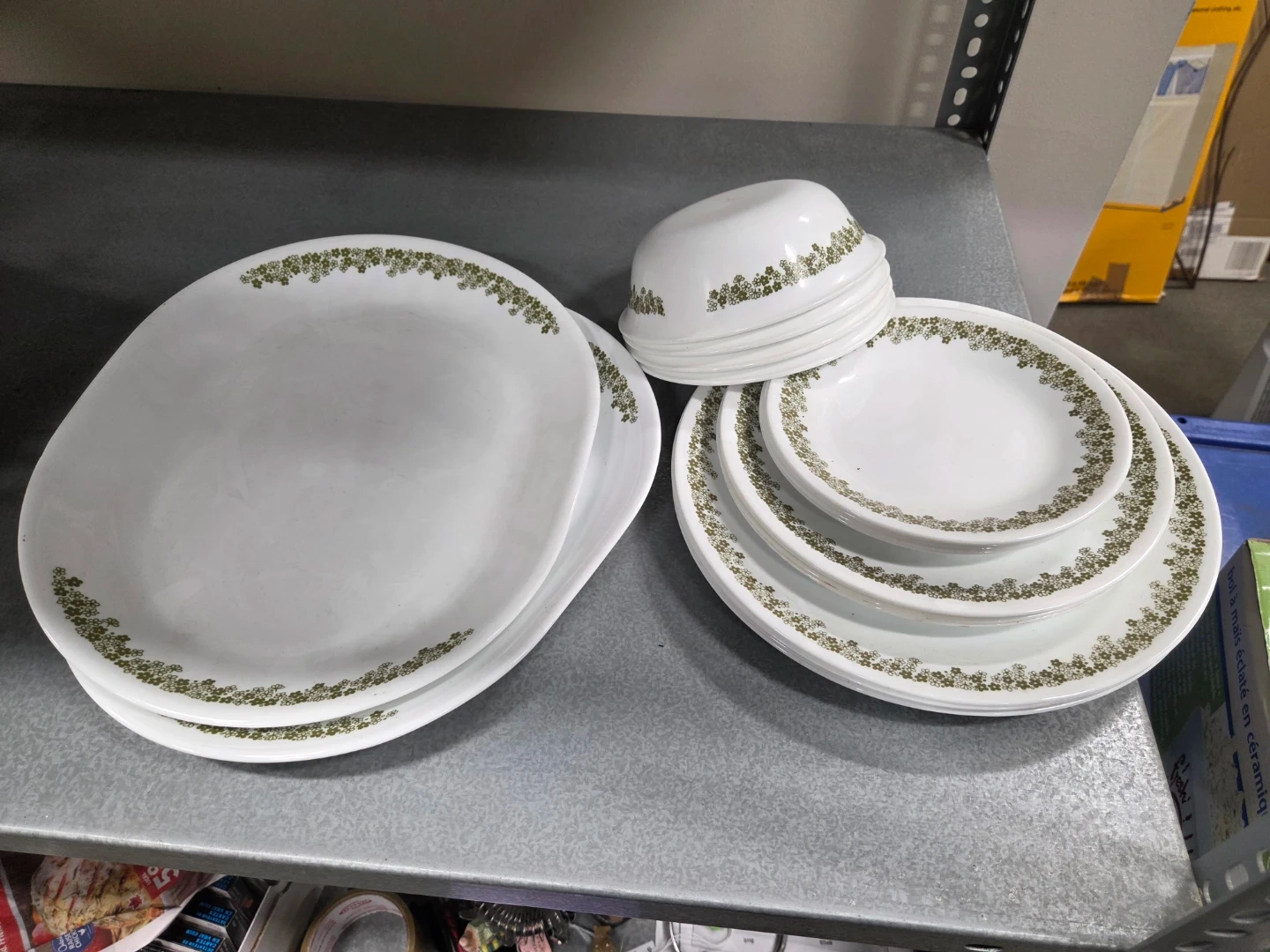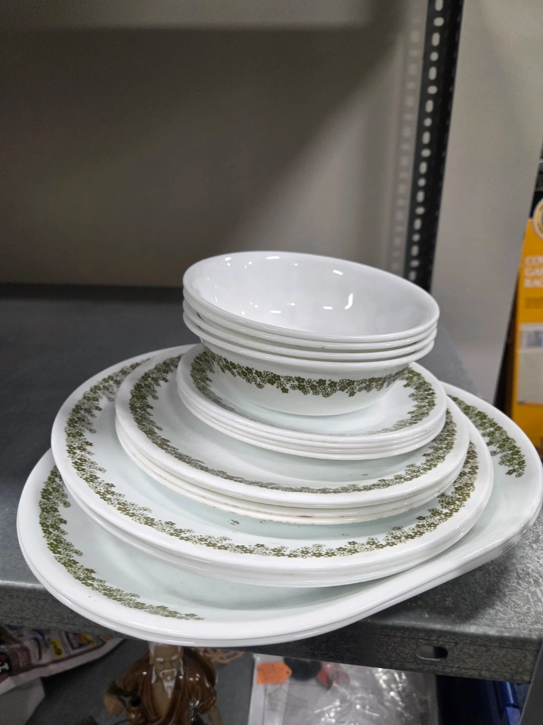 Selling a Corelle dinnerware set in the Spring Blossom pattern! This set includes plates, bowls, and serving dishes. The dishes are white with a delicate green floral design around the edges. Perfect for everyday use or special occasions!
