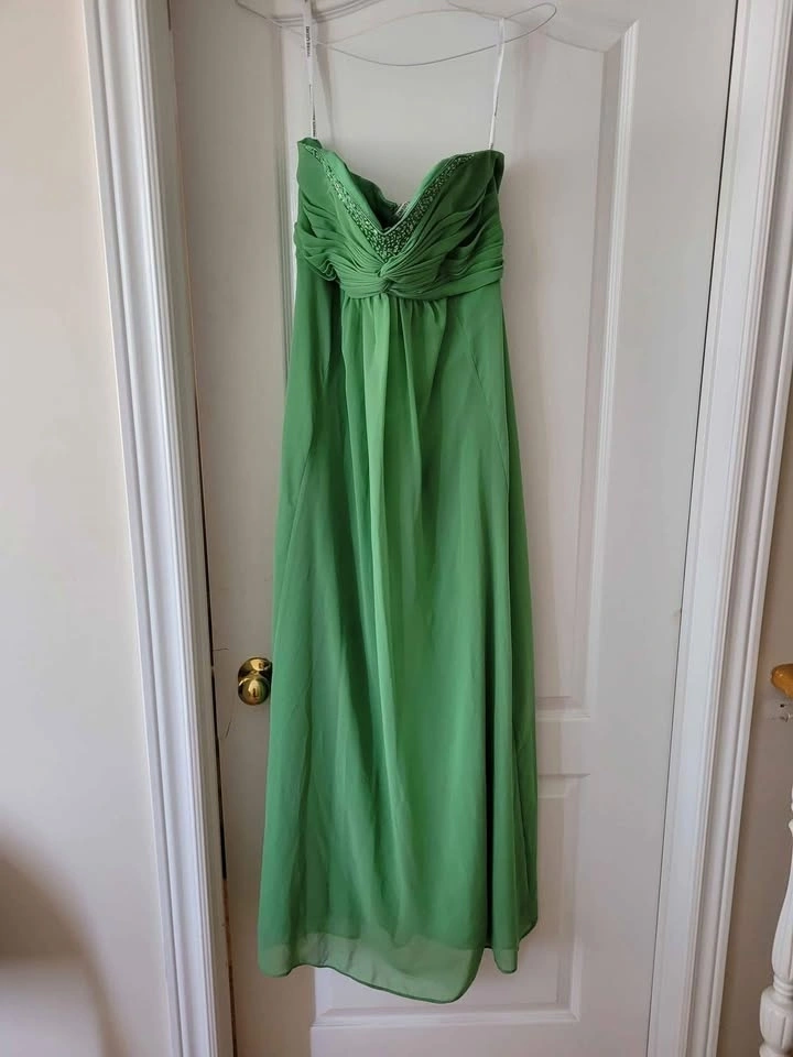 This dress is ideal for grad, prom, or a wedding. It has a very flattering fit with the top embellished with sequins and beads. This dress is sure to please!