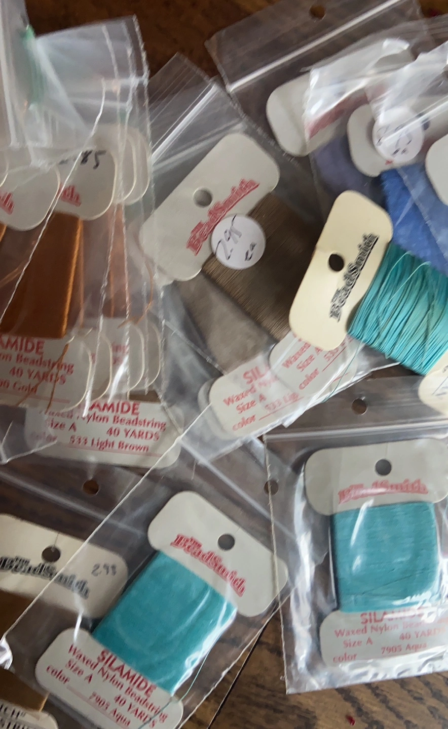 Bulk lot of various beading needles, seed beads, and waxed nylon beading thread. Includes multiple brands and colours. Great for crafting and jewellery making.