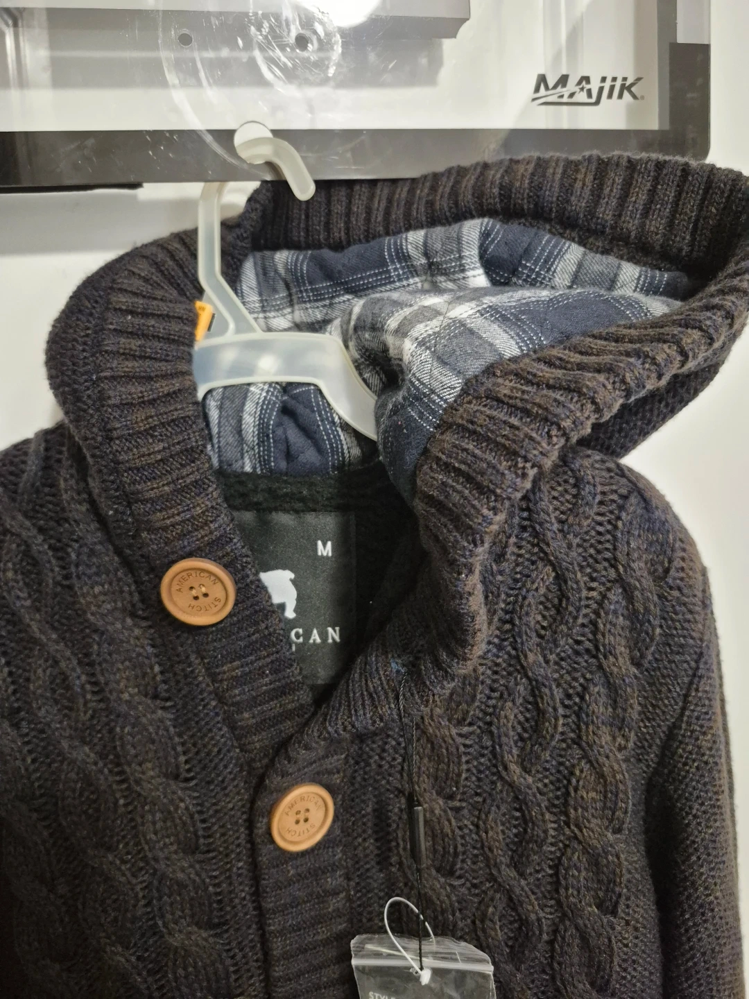 It's a dark brown, cable knit hooded cardigan from American Stitch for kid. The size is medium. It's got button closures and elbow patches. Good for the spring.