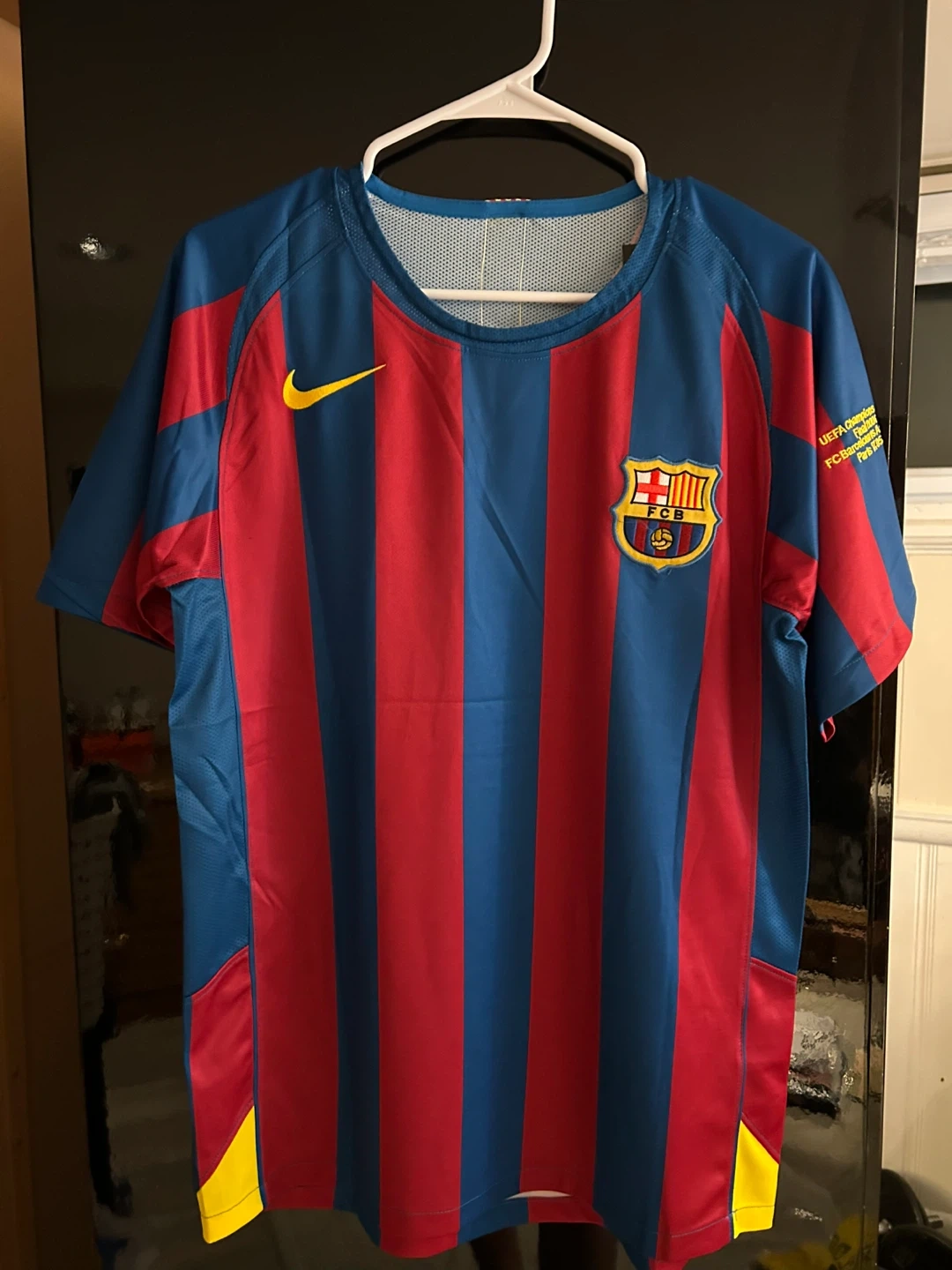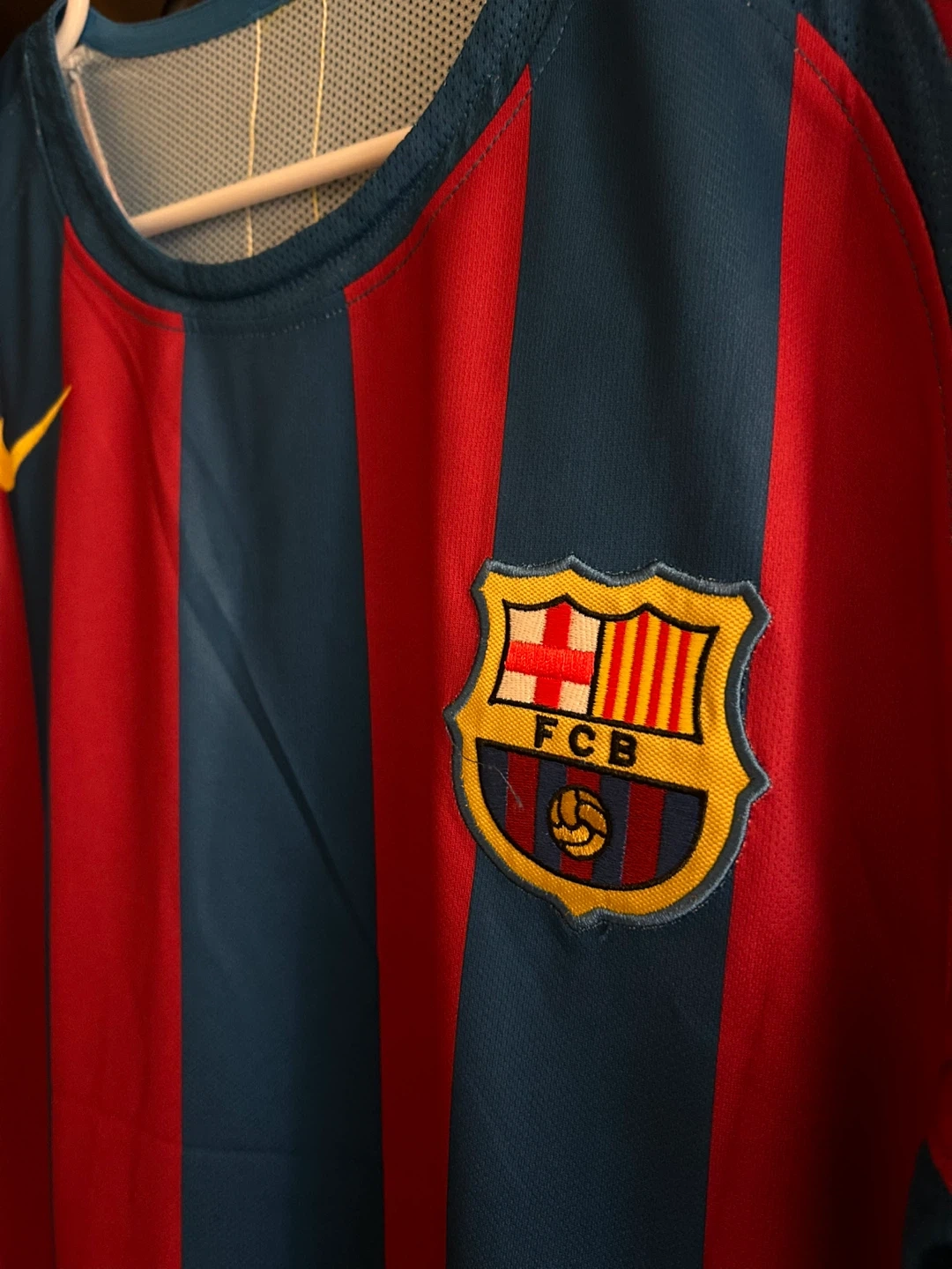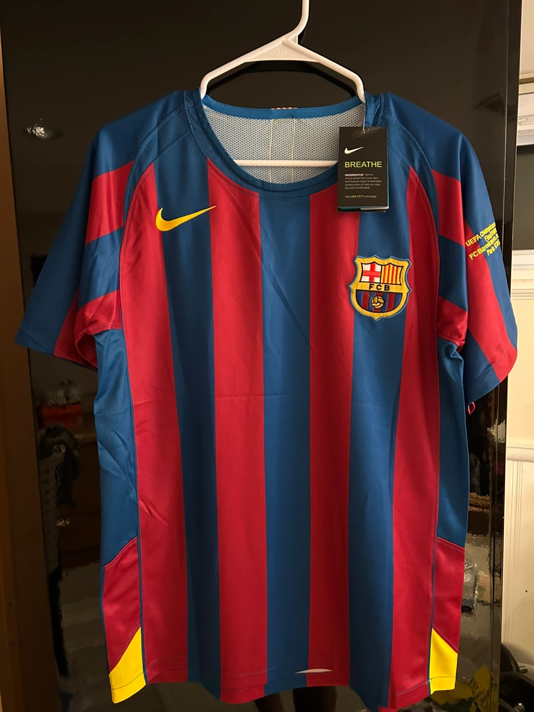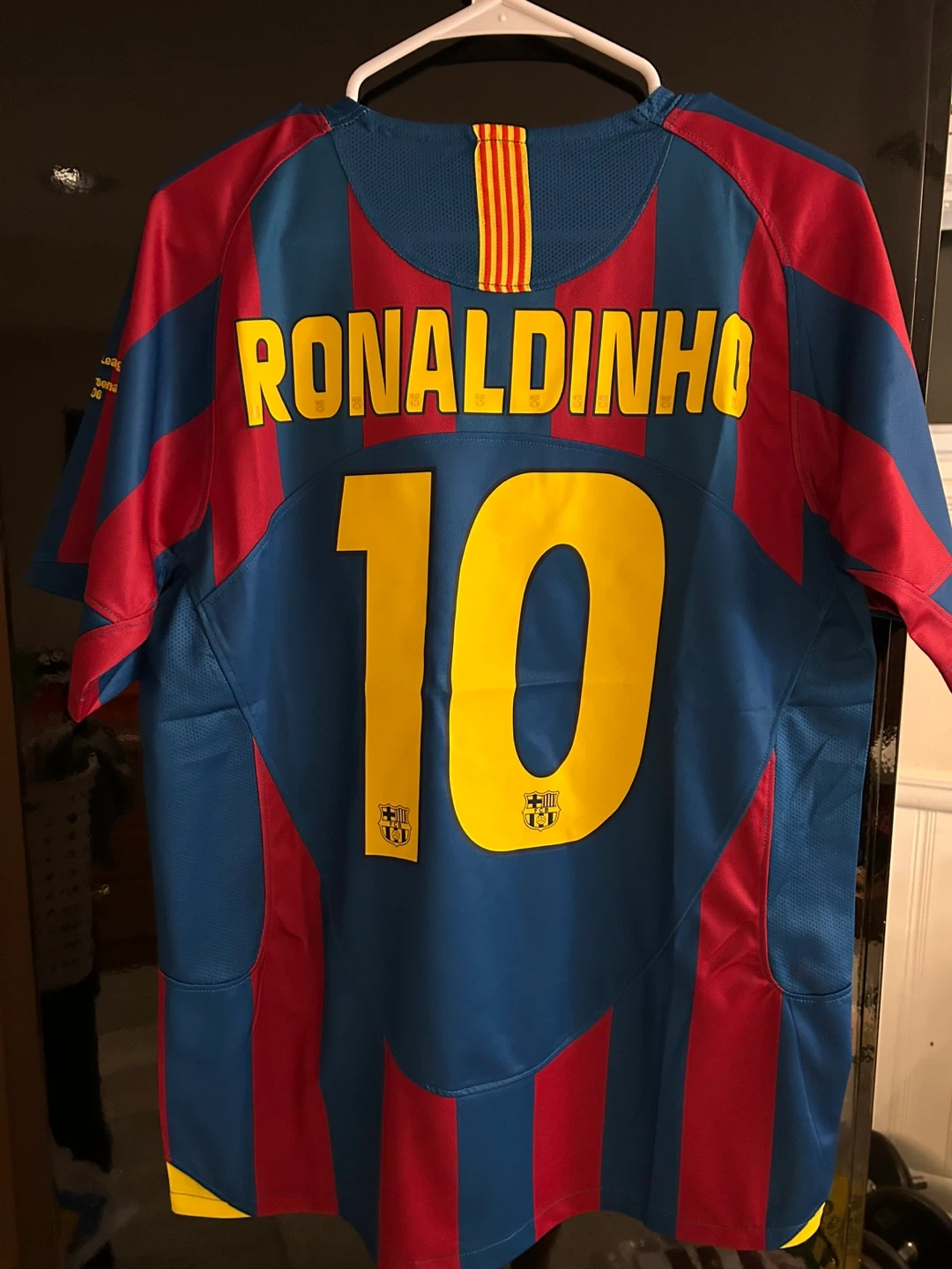 Authentic FC Barcelona jersey featuring Ronaldinho's name and number 10. This Nike shirt is made with breathable fabric. It's a must-have for any Barcelona fan!