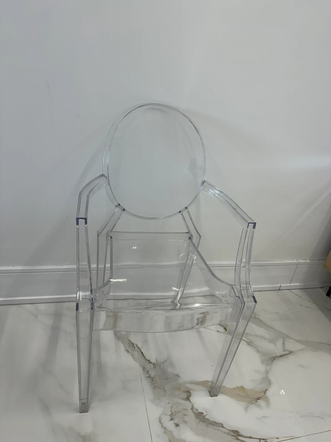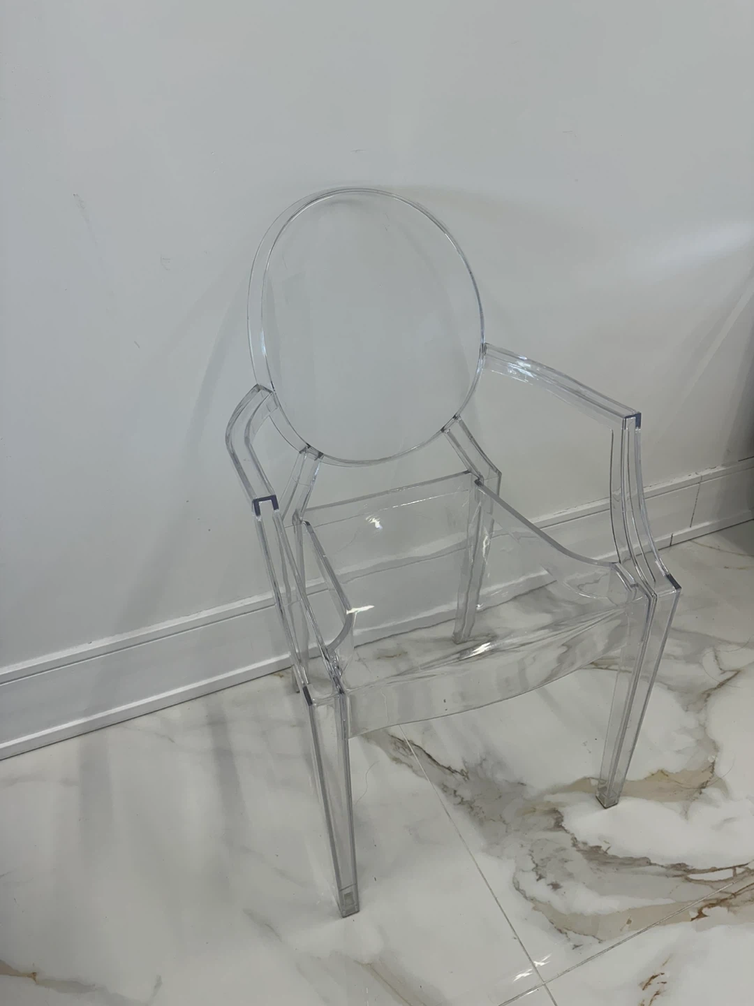Selling a clear ghost chair! This stylish chair is perfect for adding a modern touch to any room. It's in great condition and ready to be a chic addition to your home