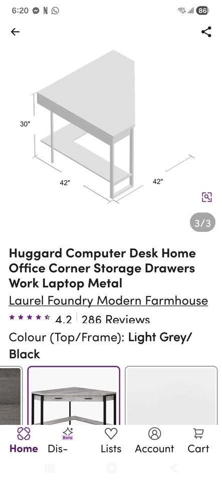 Large solid corner desk I bought from Wayfair a few years back. It fit into my apartment and could hold 2 monitors, a laptop, keyboard, and mouse pad with room to spare. Desk measurements are in the pictures.