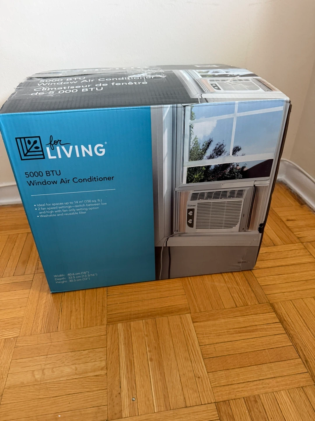 This For Living window air conditioner is 5000 BTU. It's ideal for spaces up to 14 m² (150 sq. ft.). It has a low-high switch and a window-to-window scratch between low and high settings.
