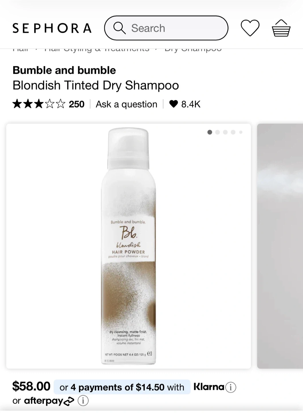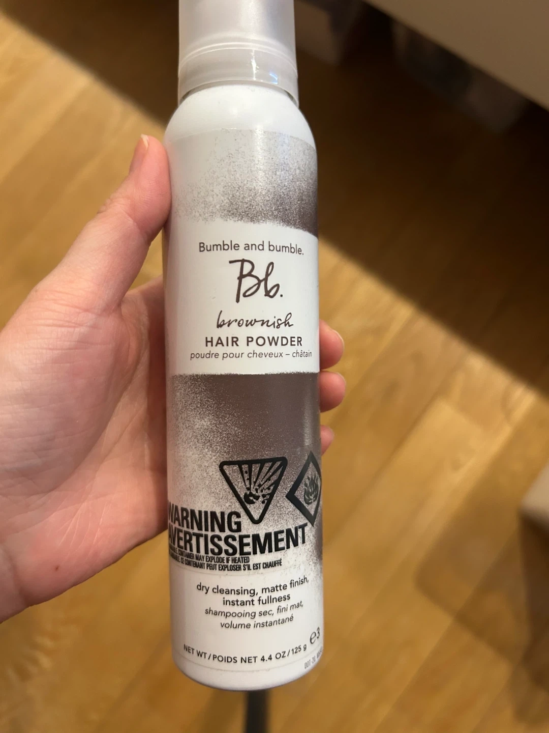 Bumble and bumble. brownish hair powder for dry cleansing, matte finish, and instant fullness. It's 125 g. This product helps add volume instantly.