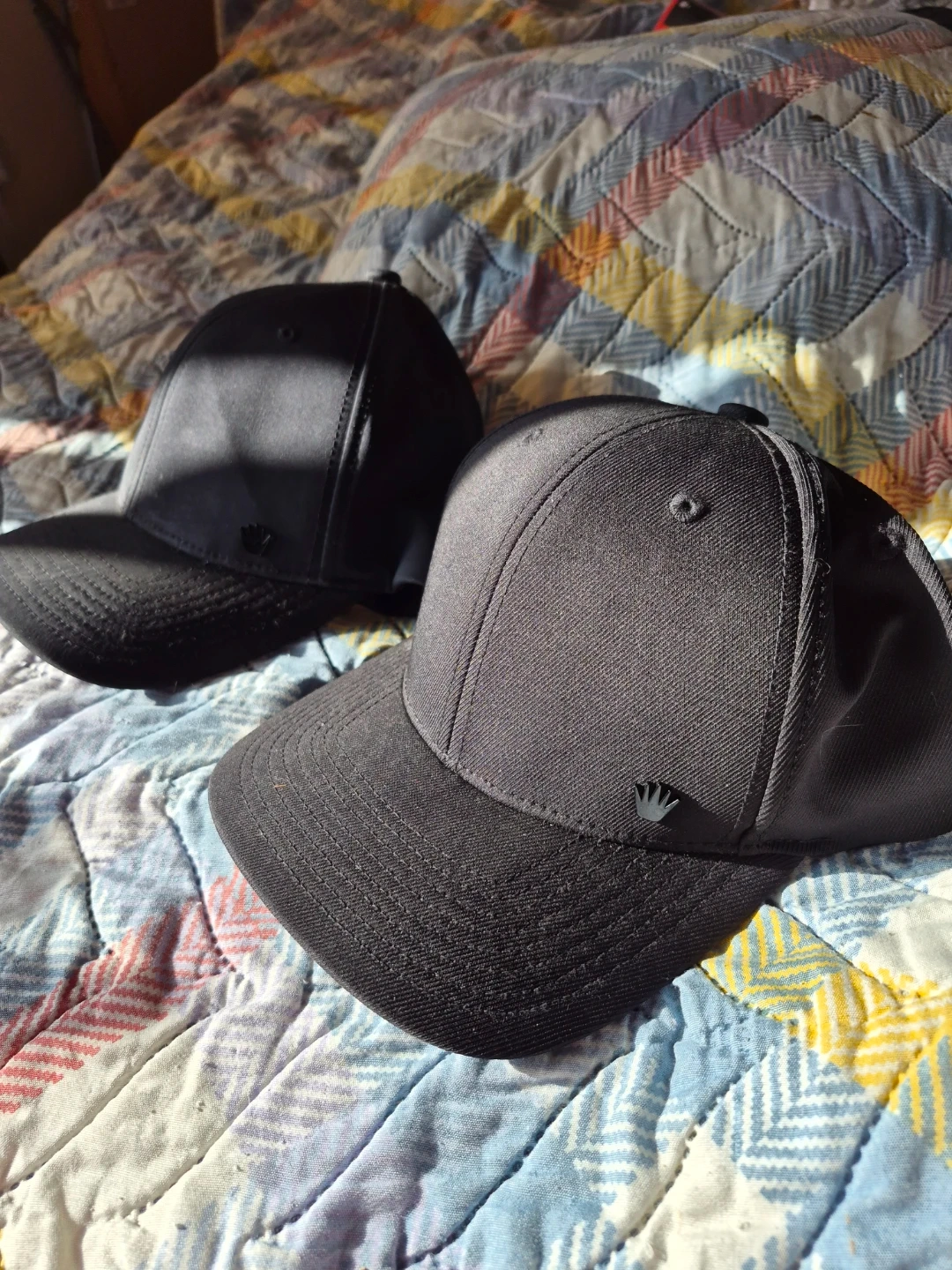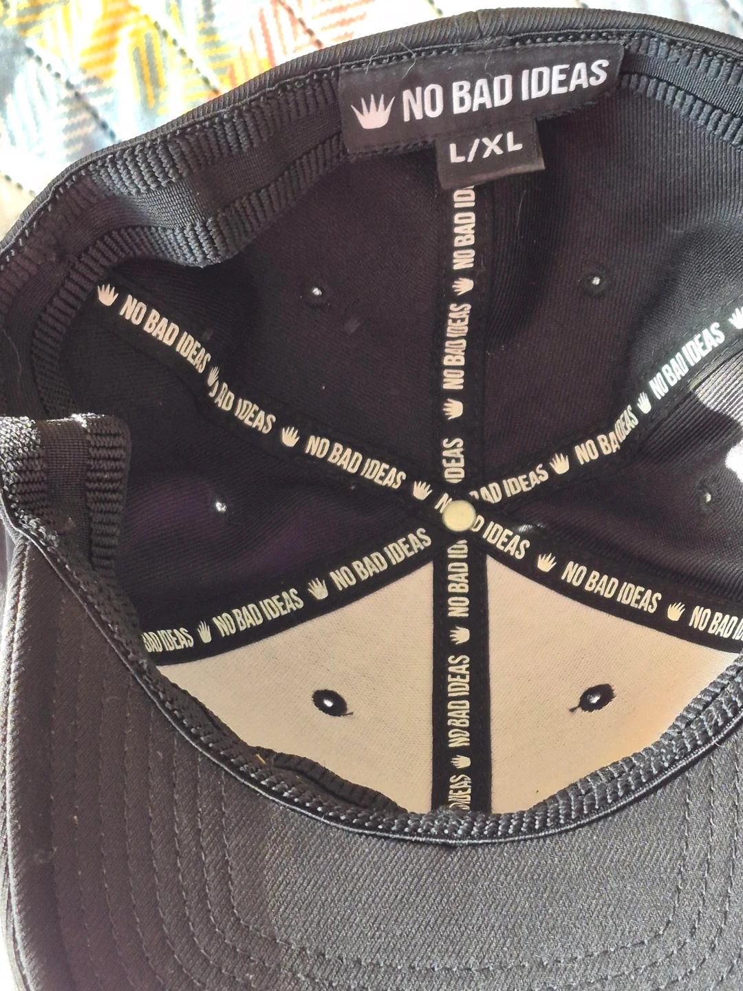 Two black baseball caps from NO BAD IDEAS. These caps are size L/XL. They're made of a durable fabric. Perfect for everyday wear!