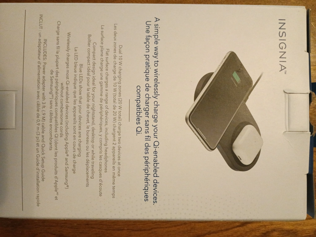 Selling a brand new Insignia 20W Dual-Device Qi Charging Station! It's perfect for charging two devices at once, with two 10W charging zones. The compact design is ideal for your nightstand, desk, or travel. Includes the power adapter and quick setup guide. Wirelessly charges most Qi-enabled devices, including Apple and Samsung devices. Get rid of those cumbersome cords!