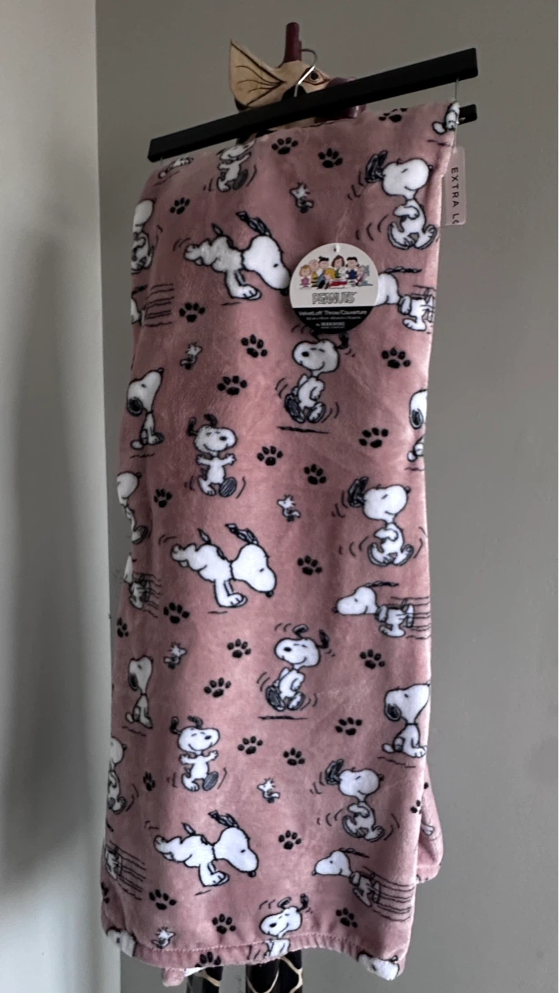 This soft pink throw blanket features a fun Snoopy and paw print pattern. It's perfect for adding a cozy touch to any room.
