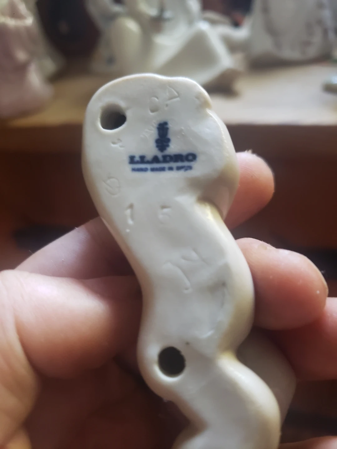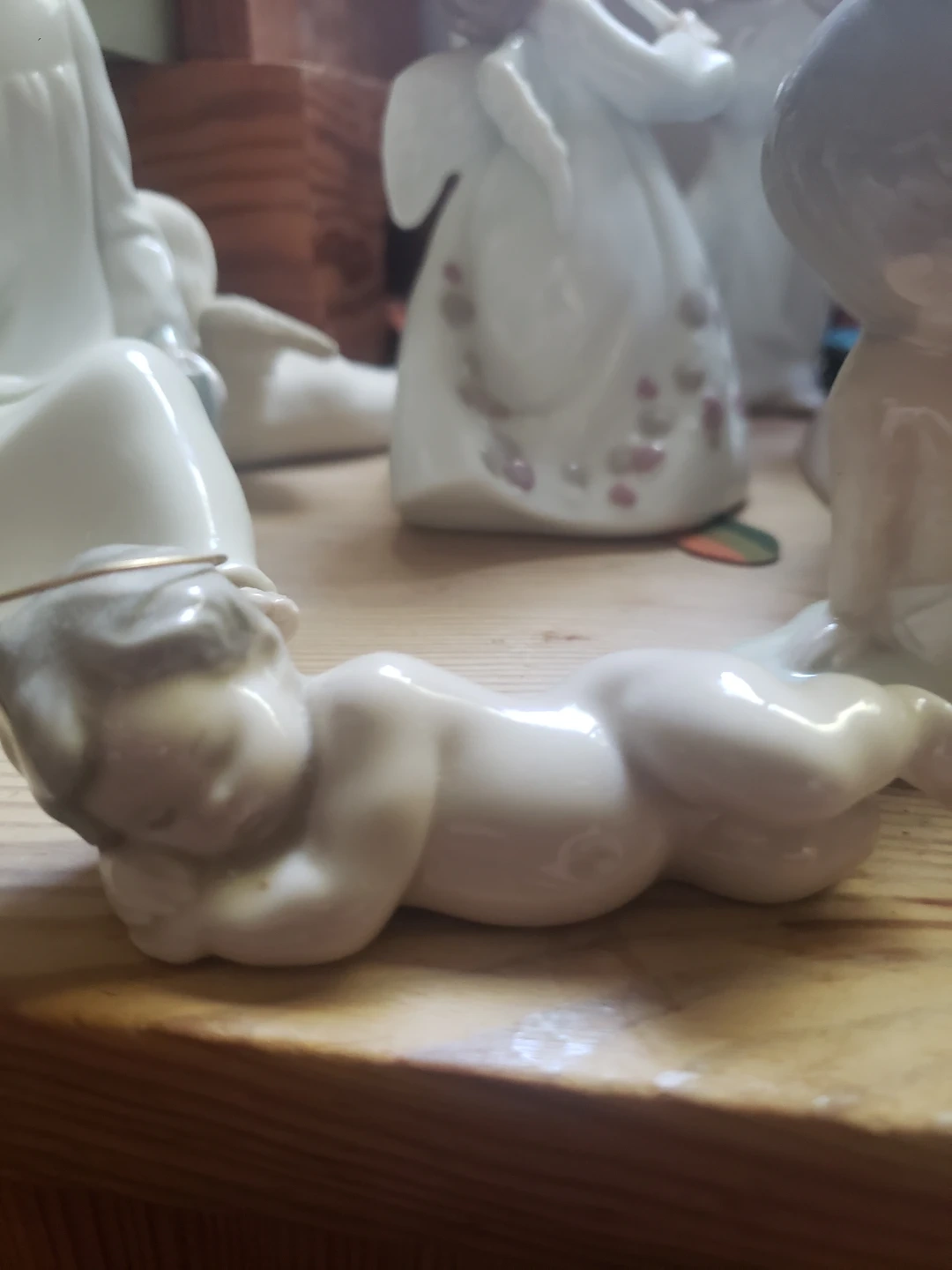 A delicate Lladro porcelain figurine of a sleeping baby Jesus, complete with a golden halo. This piece is crafted with fine detail by the renowned Lladro artisans. It's a beautiful addition to any nativity scene or collection.
