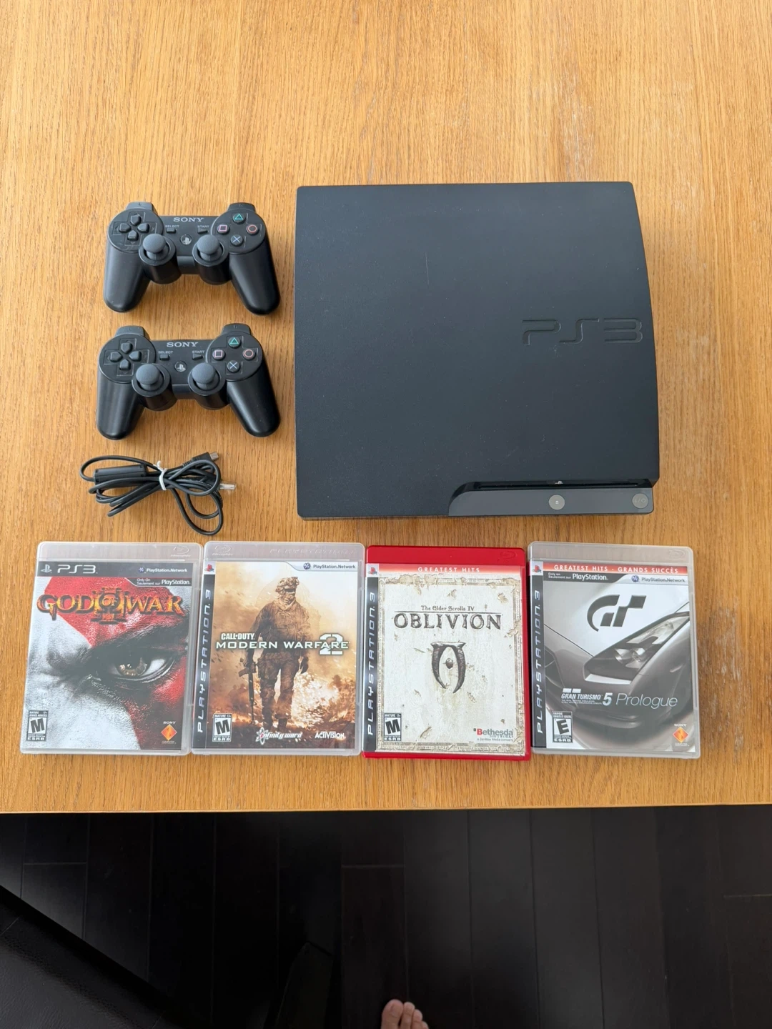 This is a black Sony PlayStation 3 console. It comes with two black DualShock 3 controllers and a charging cable. Also included are four games: God of War III, Call of Duty: Modern Warfare 2, The Elder Scrolls V: Oblivion, and Gran Turismo 5 Prologue. Great for gaming on a classic console!