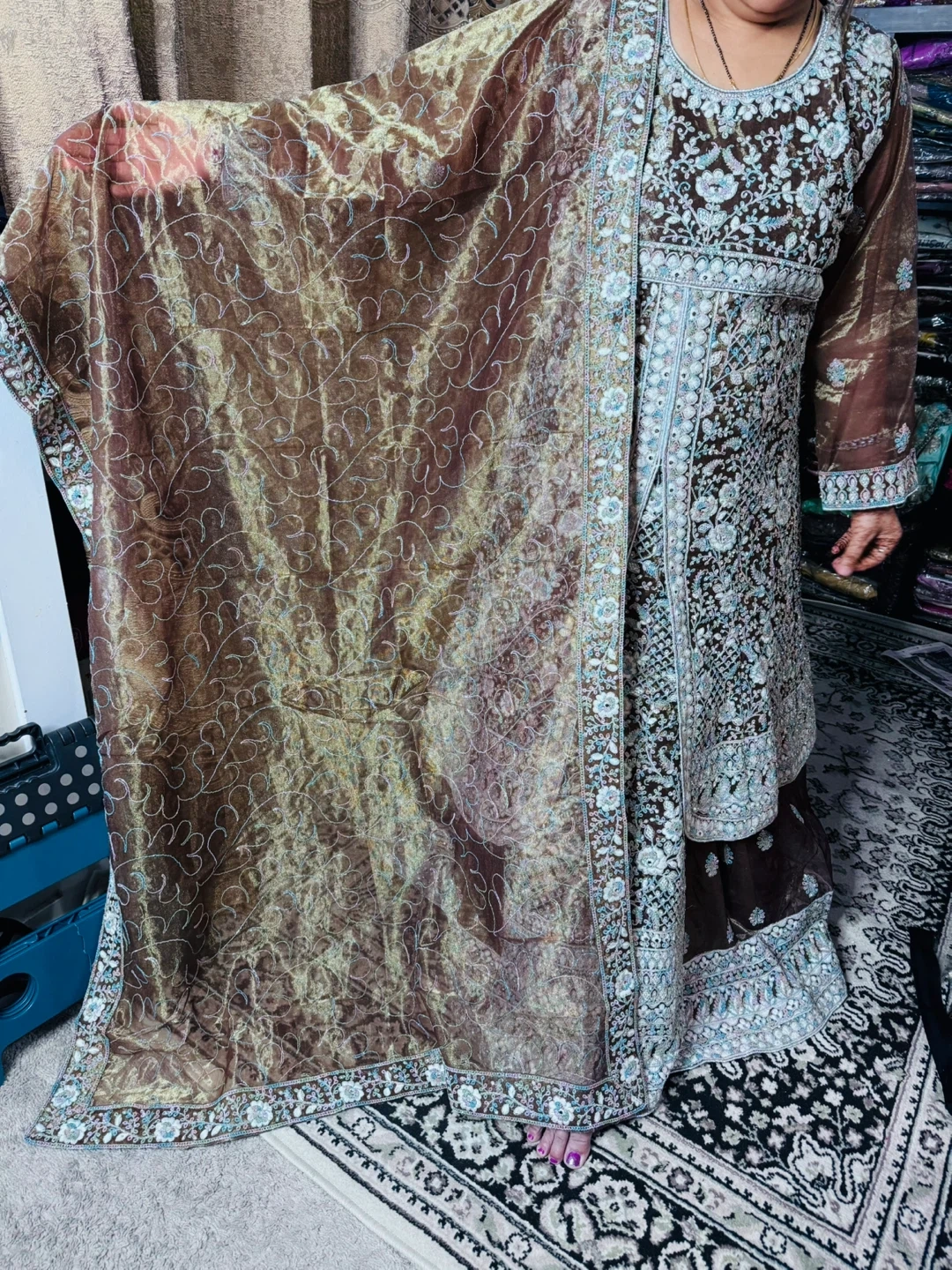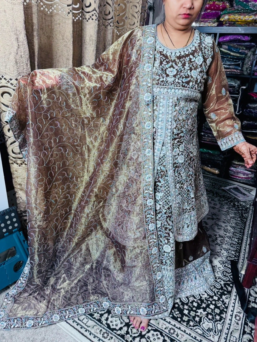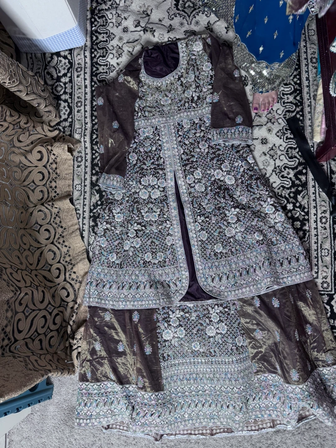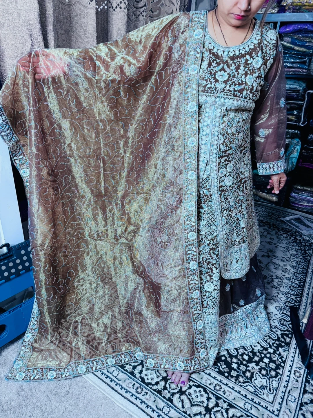Brand new Beautiful brown lehanga set with intricate blue and silver embroidery. Comes with a matching sheer dupatta featuring embroidered borders. Material is lightweight and elegant, perfect for special occasions.