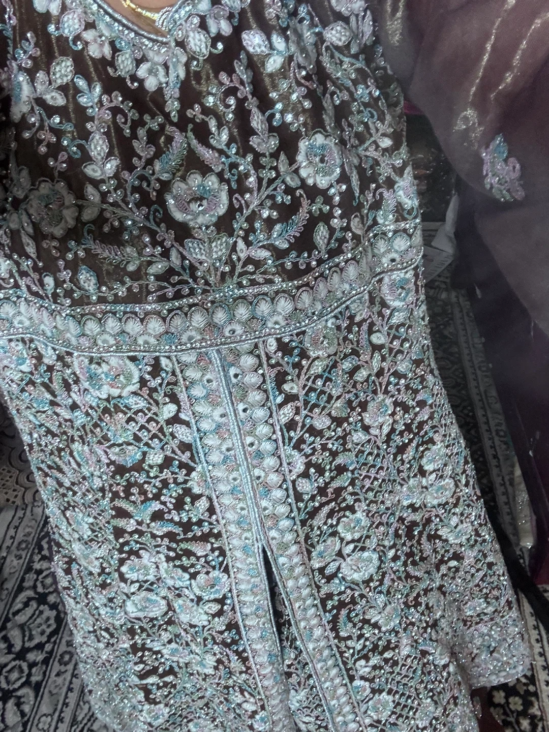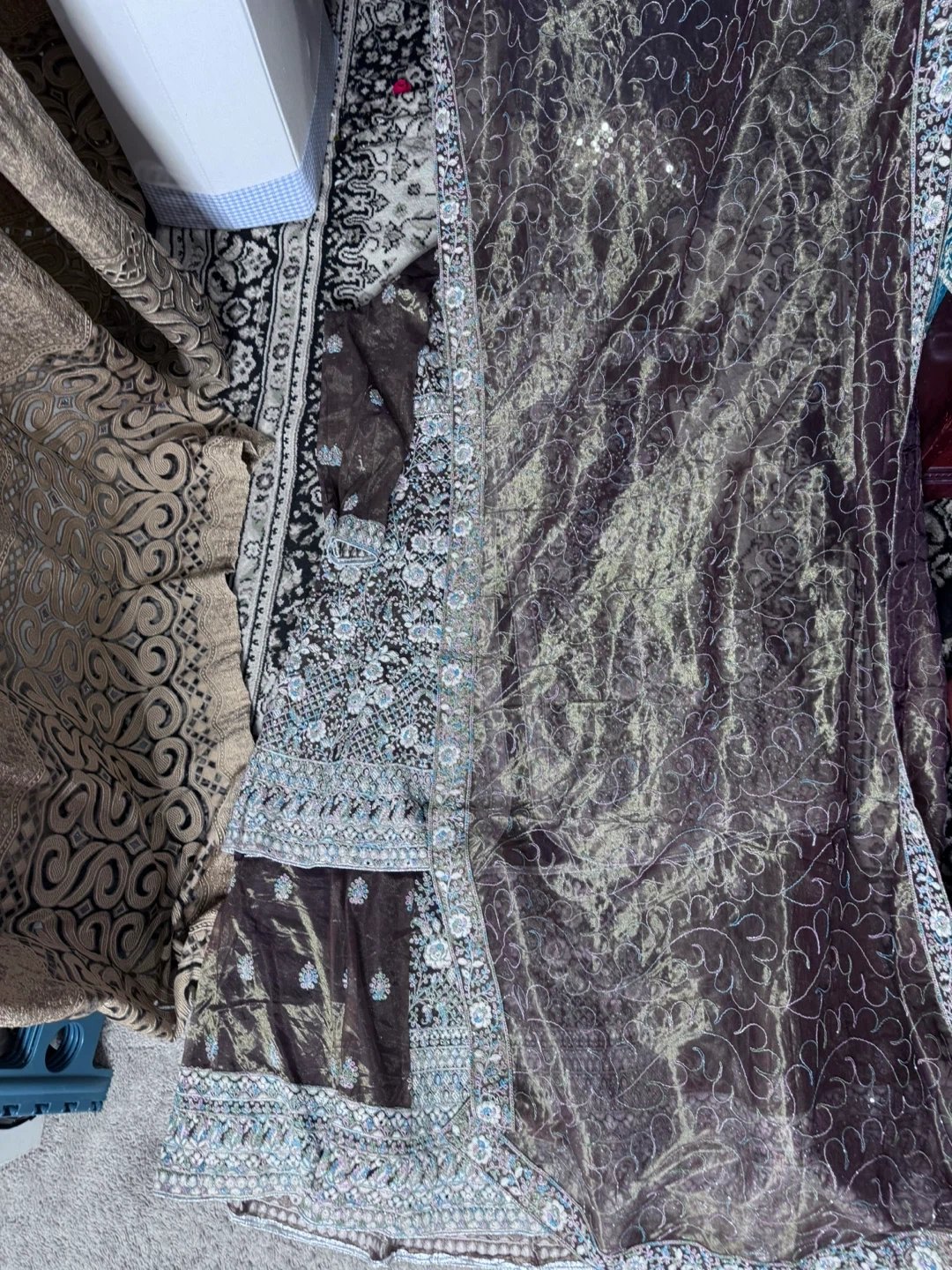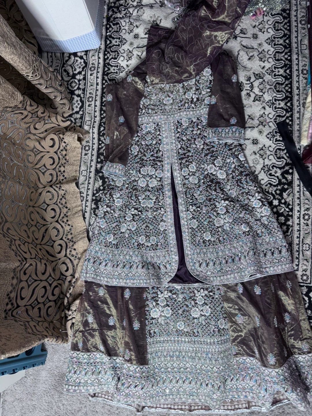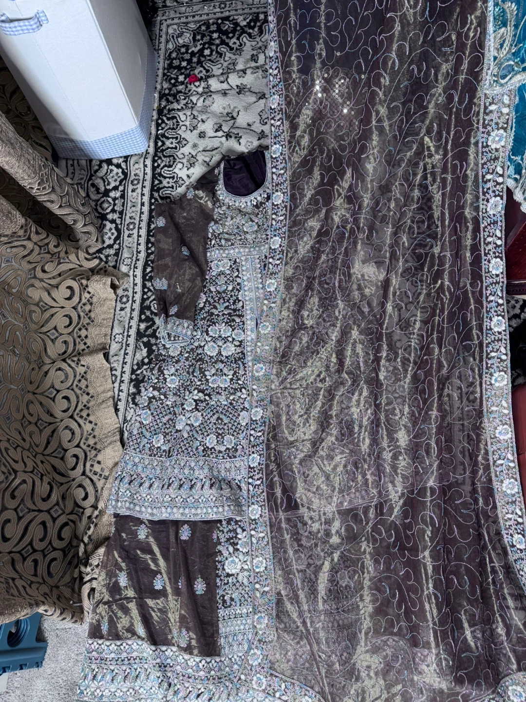 Brand new Beautiful brown lehanga set with intricate blue and silver embroidery. Comes with a matching sheer dupatta featuring embroidered borders. Material is lightweight and elegant, perfect for special occasions.