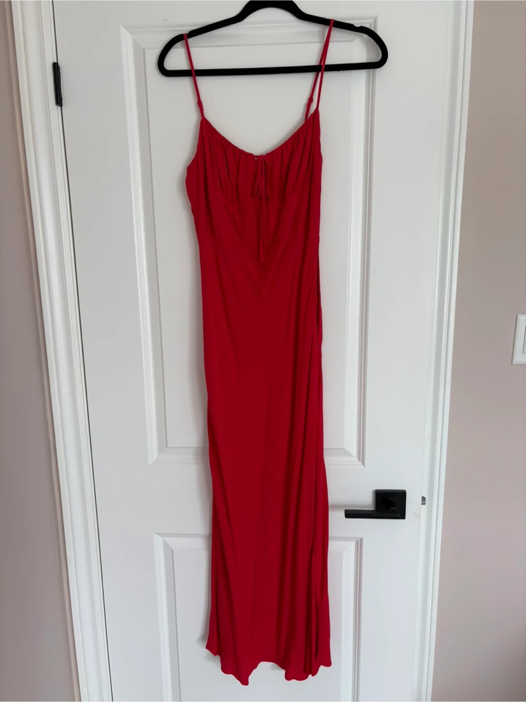 This is a Wilfred red spaghetti strap maxi dress. It features a tie-front detail and smocking at the bust. This dress is perfect for a night out or a special occasion!