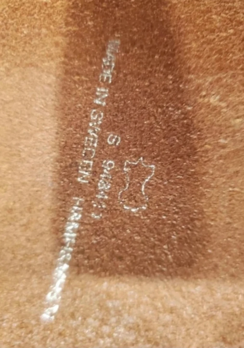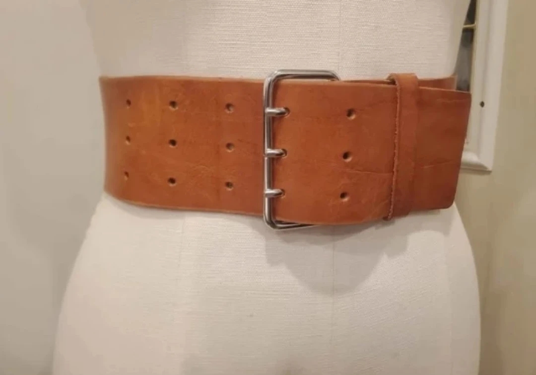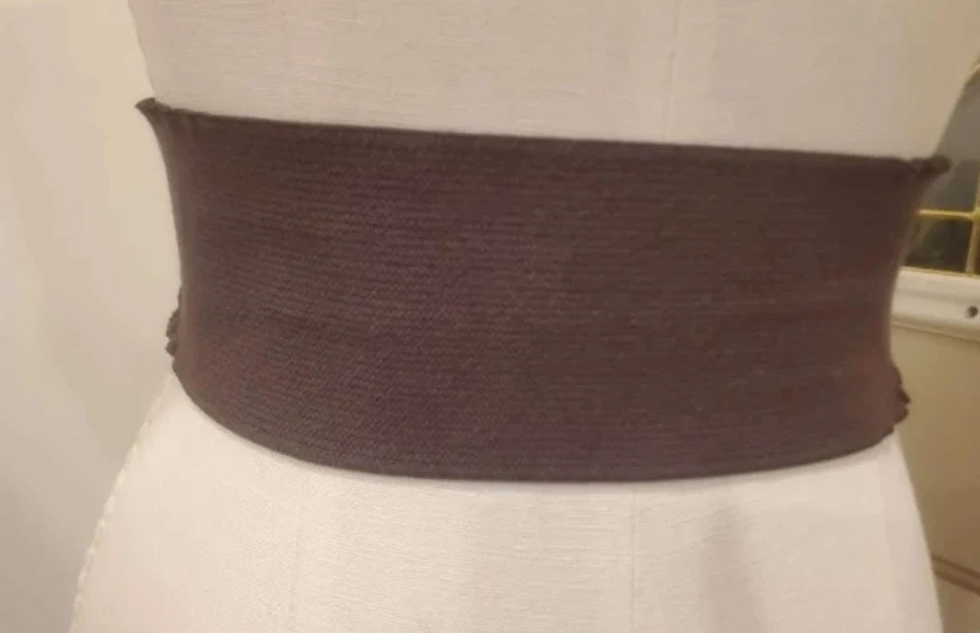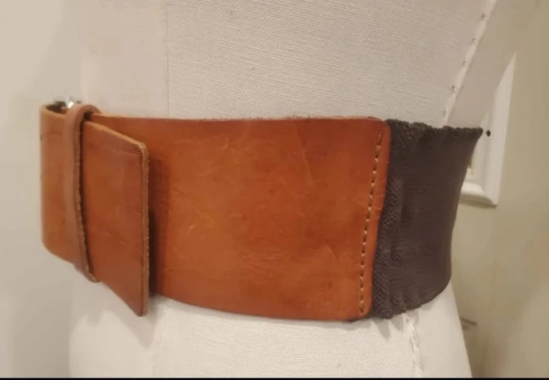 Wide tan leather obi style belt with double buckle closure. Made in Sweden. This belt adds a unique touch to any outfit. It's leather with a fabric backing. Pickup location eglinton and dufferin area
