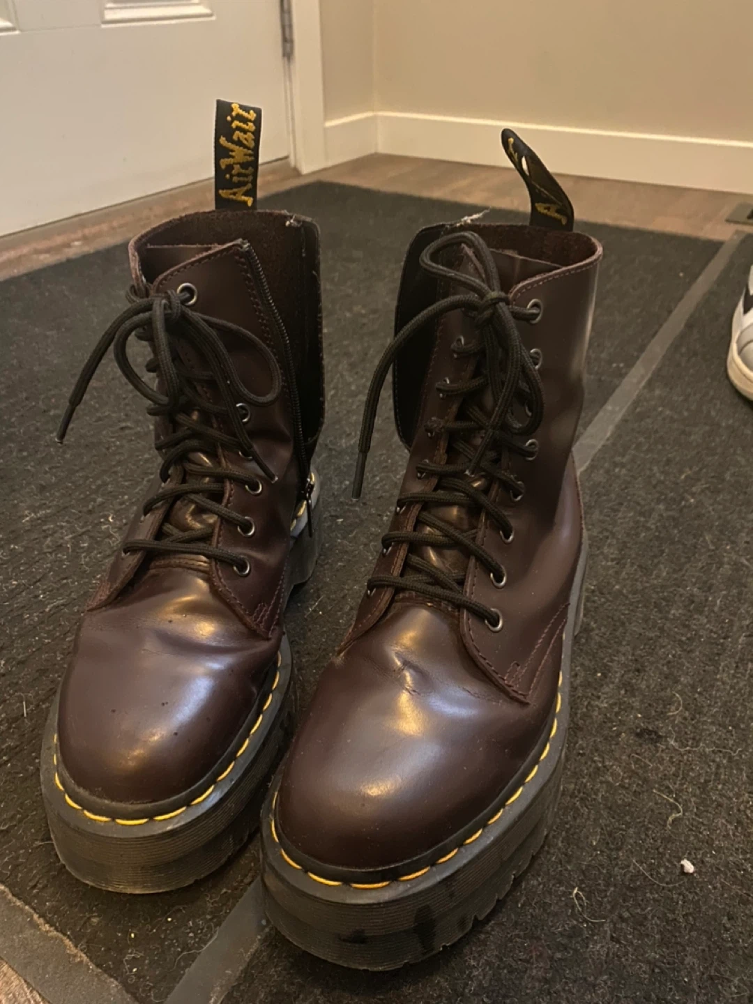 Dr. Martens Jadon platform boots in a deep burgundy colour. These boots feature a side zip for easy wear, in addition to the laces. Built for durable use, barely worn. Slight crease but only selling them because they fit too big on me. Selling for half price!! Also alright with trades! Looking for ankle boot/loafer docs!