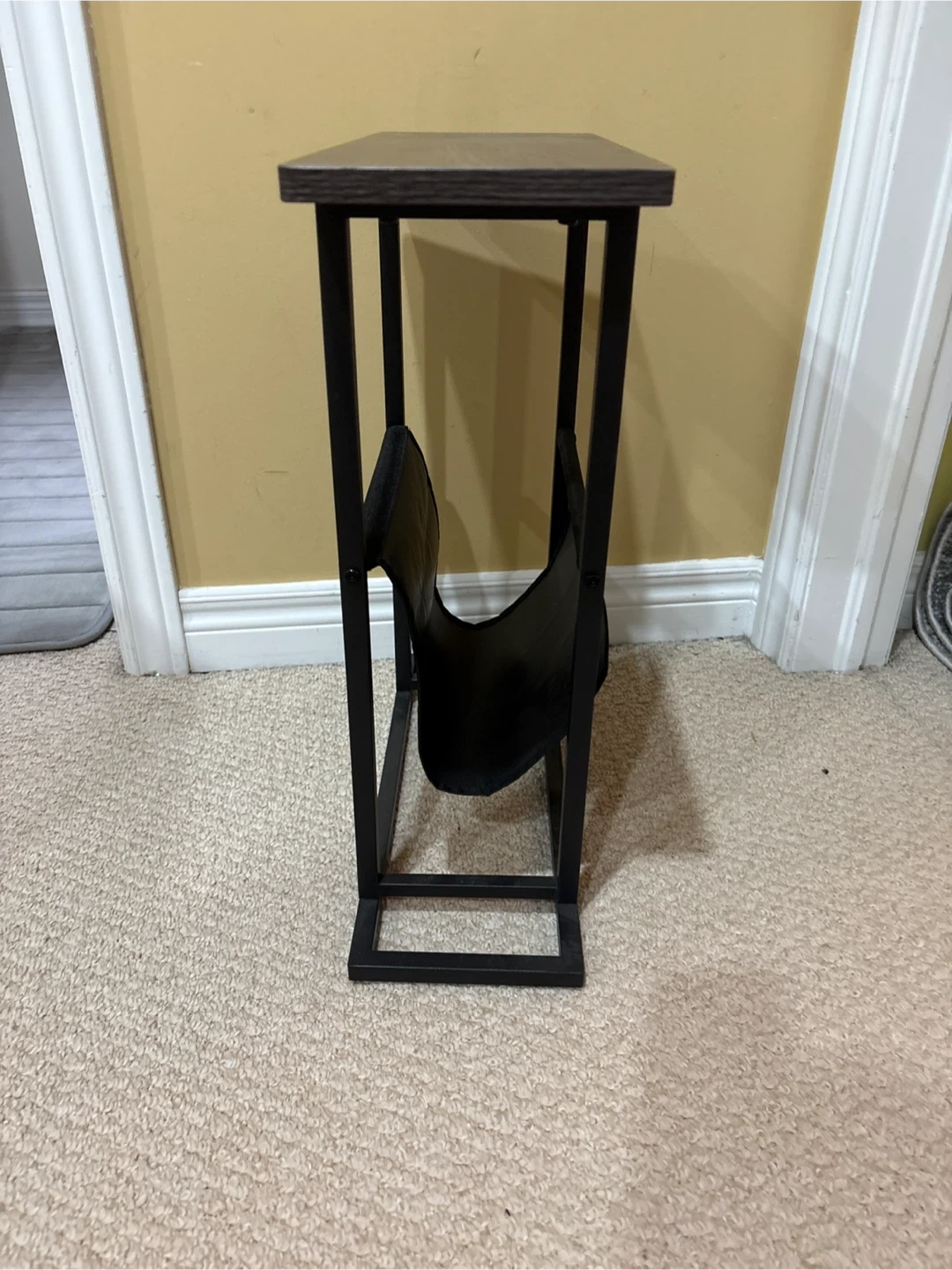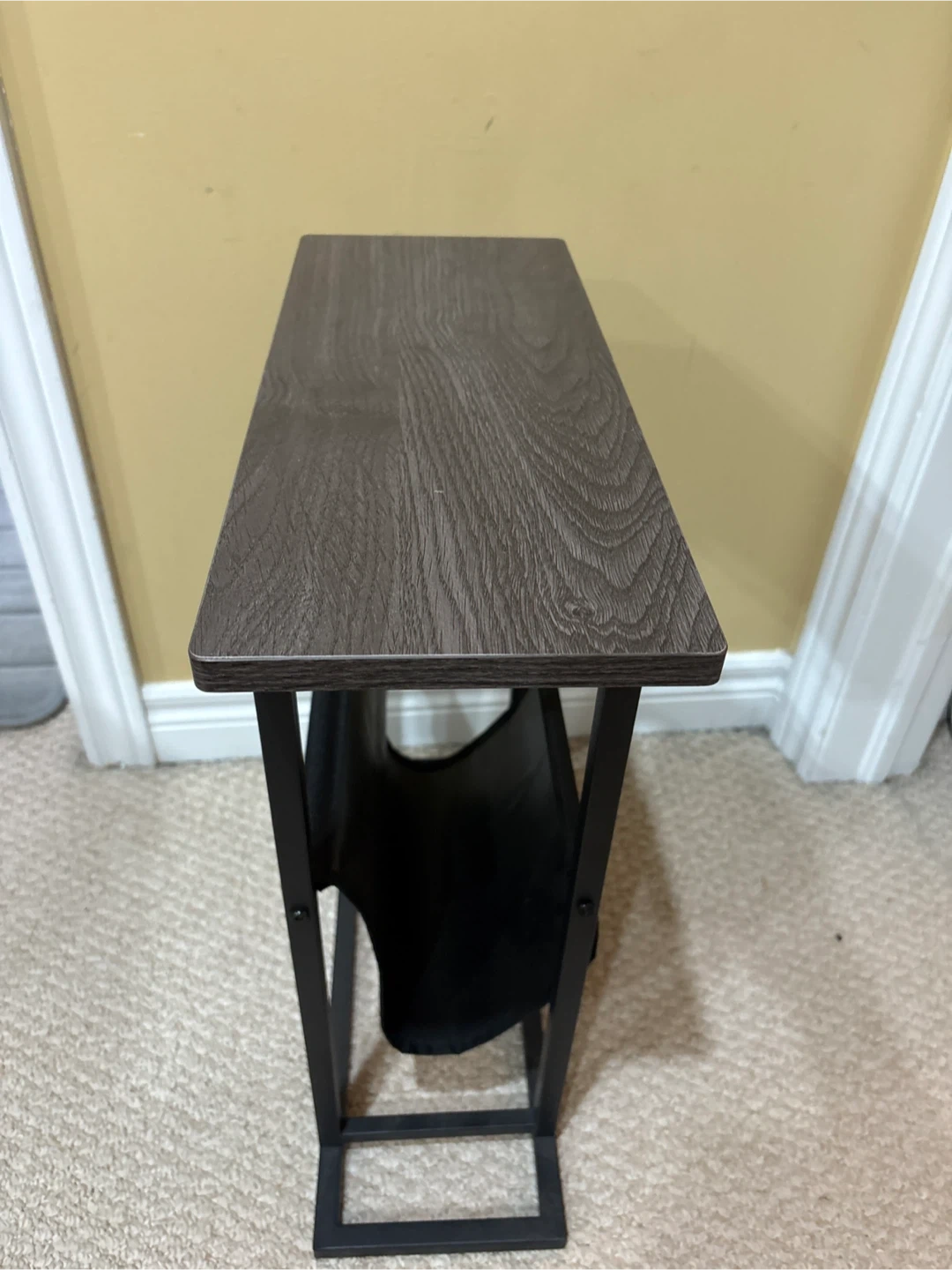 This side table features a dark wood-grain top and a black fabric magazine rack underneath. Its slim design makes it handy for placing beside a sofa or chair. The metal frame offers sturdy support.