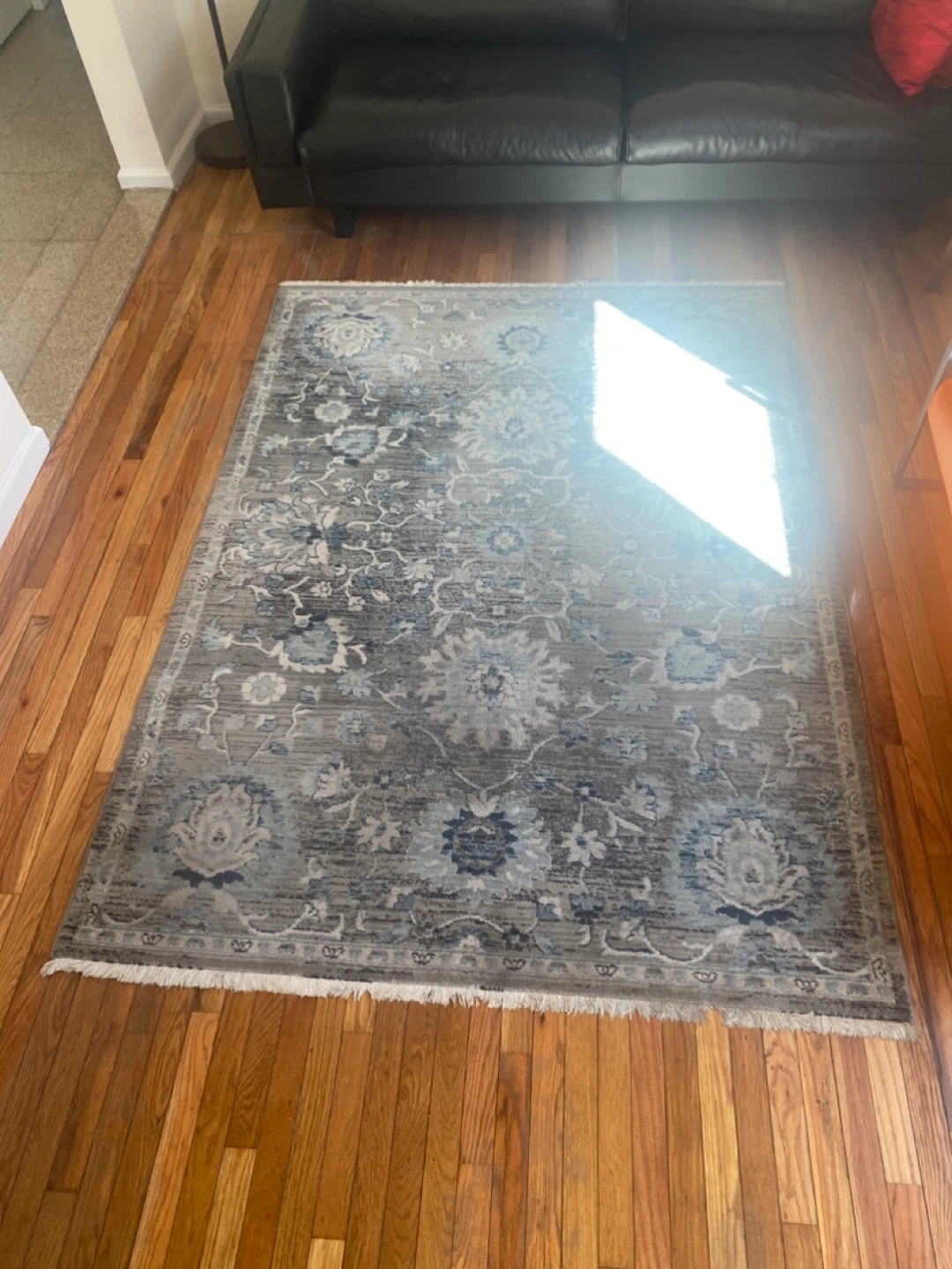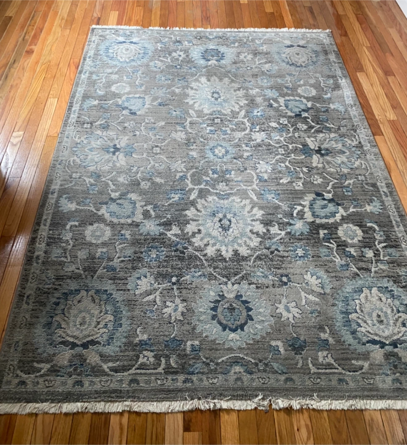 This area rug features a beautiful floral damask pattern in shades of grey and blue. It's a lovely addition to any room. The rug has a fringe on both ends.