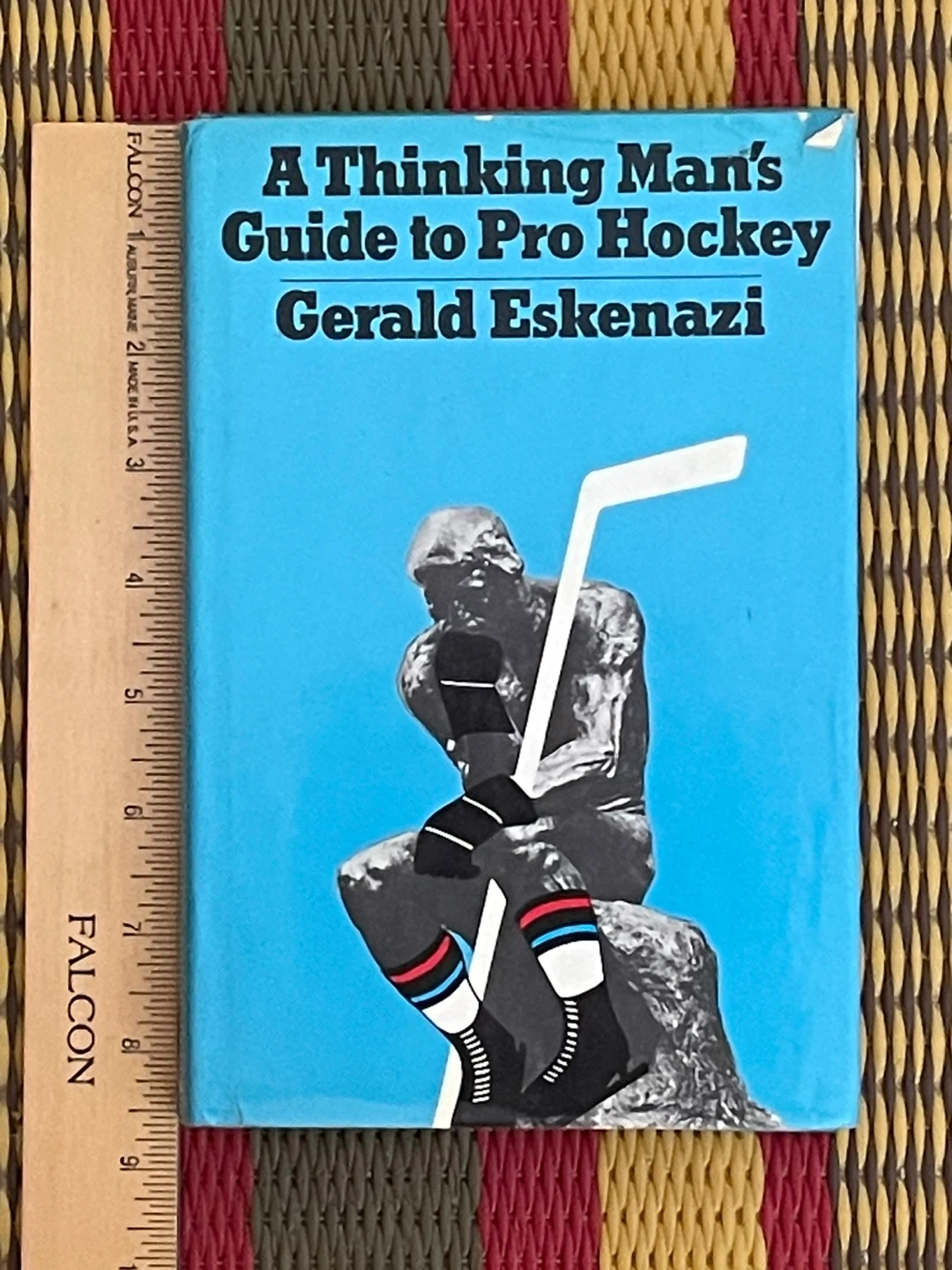 This is "A Thinking Man's Guide to Pro Hockey" by Gerald Eskenazi. It's a book exploring the intricacies of professional hockey. It's a non-fiction read for hockey enthusiasts. 244 pages. No illustrations. Third printing 1973. Near fine condition.