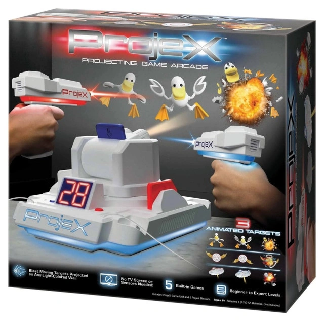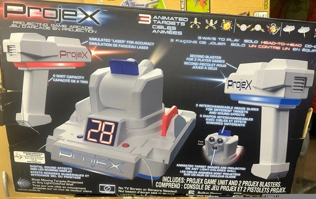 Selling brand new Projex Laser game. Sells at Toys R Us for $70, selling it for $50 brand new. Projex is the Projecting Arcade Machine that projects moving targets on any light-colored wall! Choose from 5 different games and 3 different skill levels. Blast Targets, UFOs or Ducks! One or two players can play. Features 3 Different Target Images: Duck, Target, and UFO. Has 5 Built-in-Games and 3 Levels - Beginner to Expert. No TV screen or sensors are needed to play. Features simulated "laser" for accuracy and 6-shot capacity, second blaster for 2-player games, and 3 interchangeable image slides for different targets and sound effects. Target images can be projected on any light-colored wall and features digital sound effects and LED scoring display. There are 3 ways to play: Solo, Head-to-Head, and Co-op.