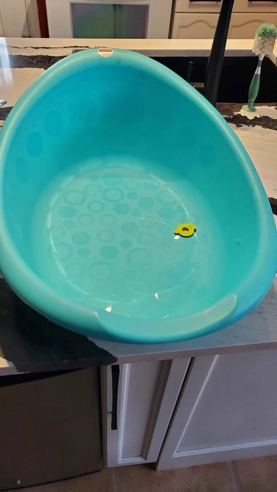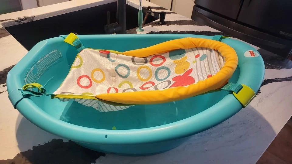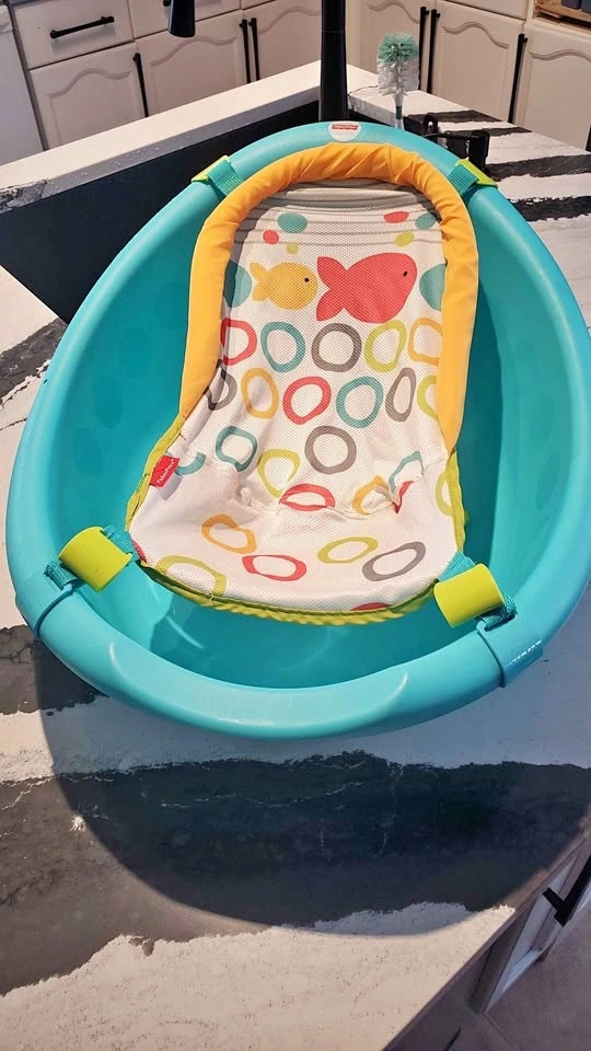 Fisher-Price baby bath tub. Seat has 2 height settling clips to adjust as baby gets heavier. Has a couple puppy chew marks on one side and minor scuff marks. $5