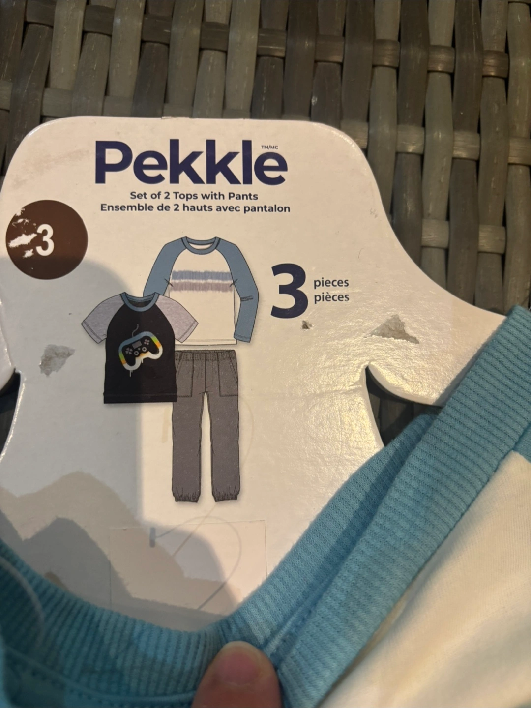 This Pekkle set includes two tops and one pair of pants. One top features a graphic print and the other has a tie-dye design. The pants are a solid grey colour with an elastic waistband.