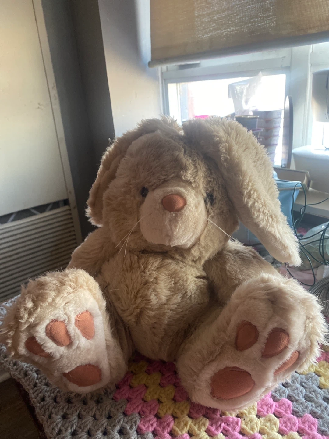 A soft, brown plush bunny rabbit toy. Features embroidered paw pads and whiskers. It's perfect for a child's toy collection or as a decorative item. Super cuddly!
