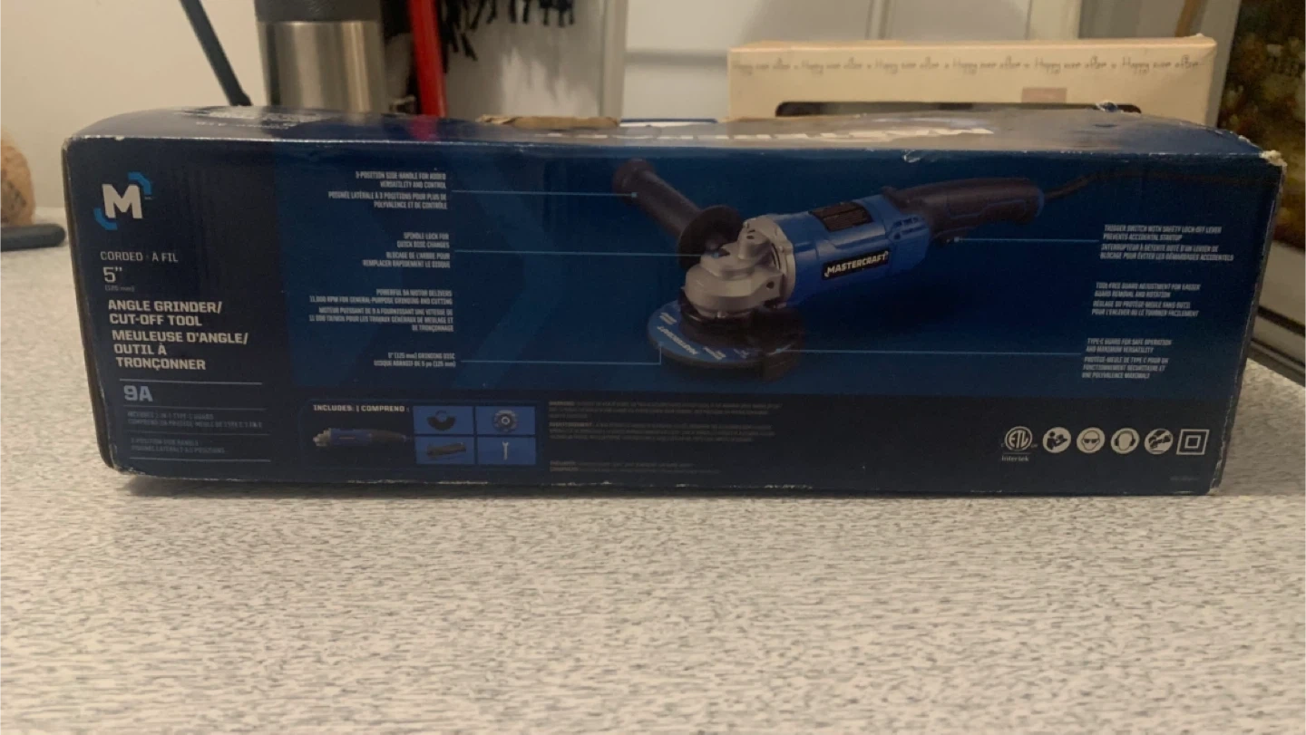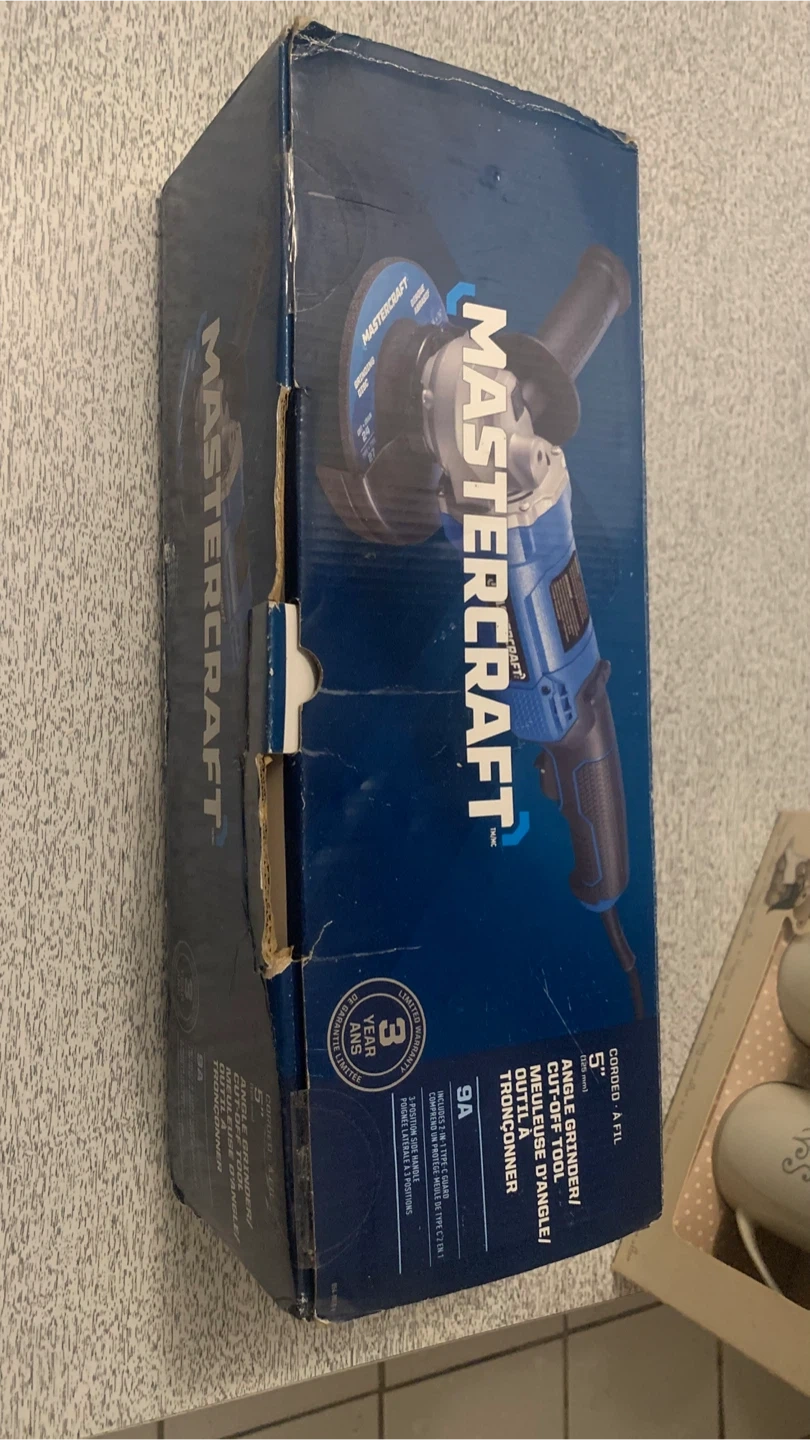 This Mastercraft angle grinder is a corded 9A model designed for cutting and grinding tasks. It includes essential accessories for immediate use. It's a powerful tool for various DIY and professional projects. I also have a few unused 5” discs which I’m including with the sale.