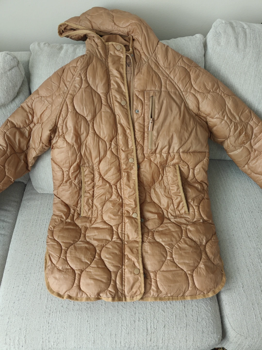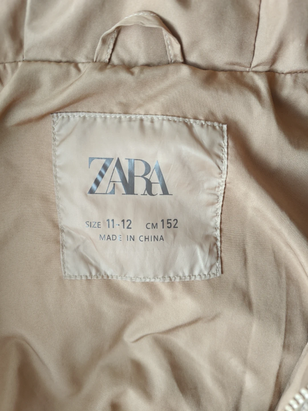 Tan quilted jacket from Zara. It's a size 11-12 years, which is CM 152. It has a zip-up front with snap buttons, two front pockets, and a zippered chest pocket. It's great for keeping warm during cooler weather!