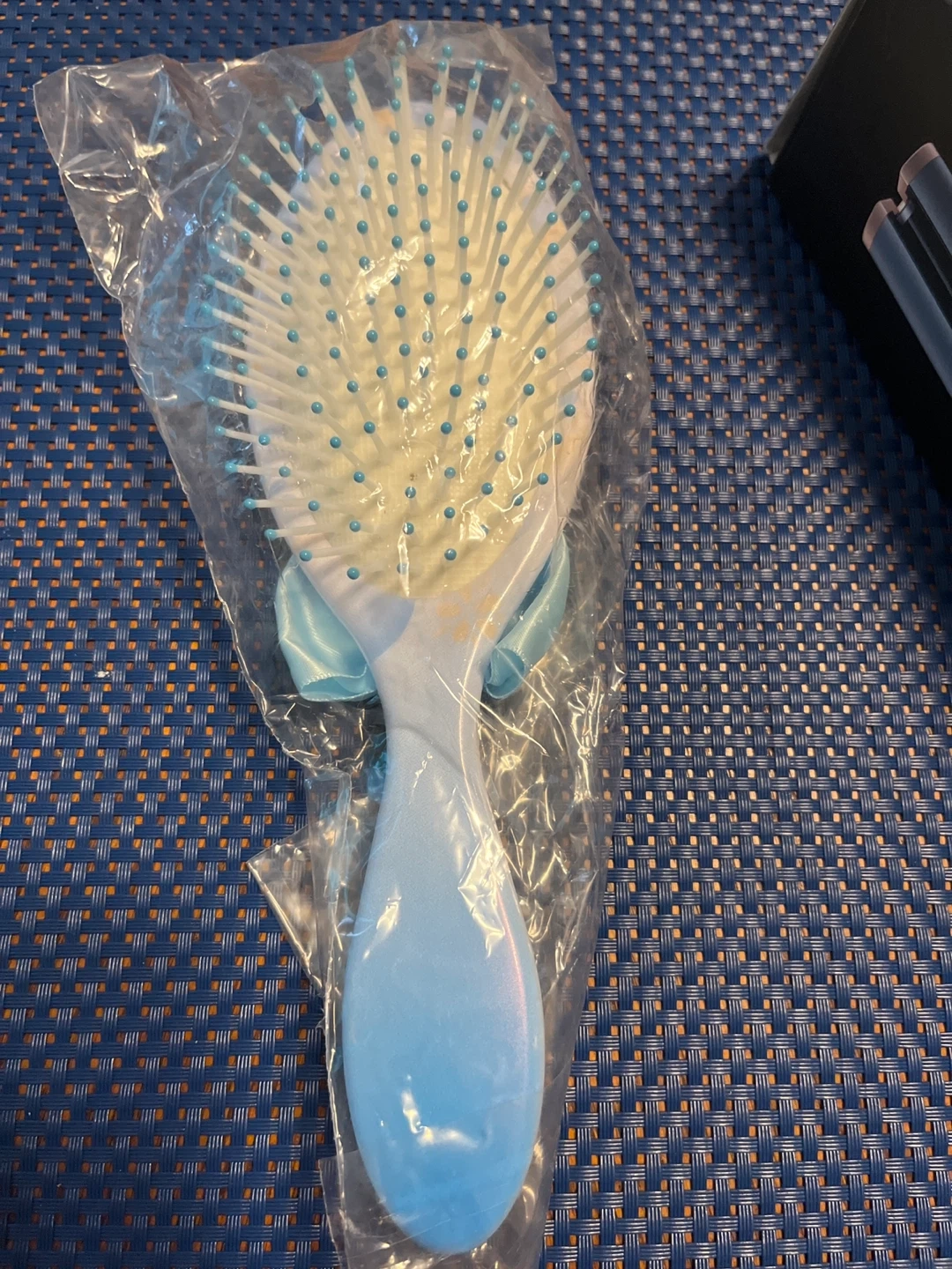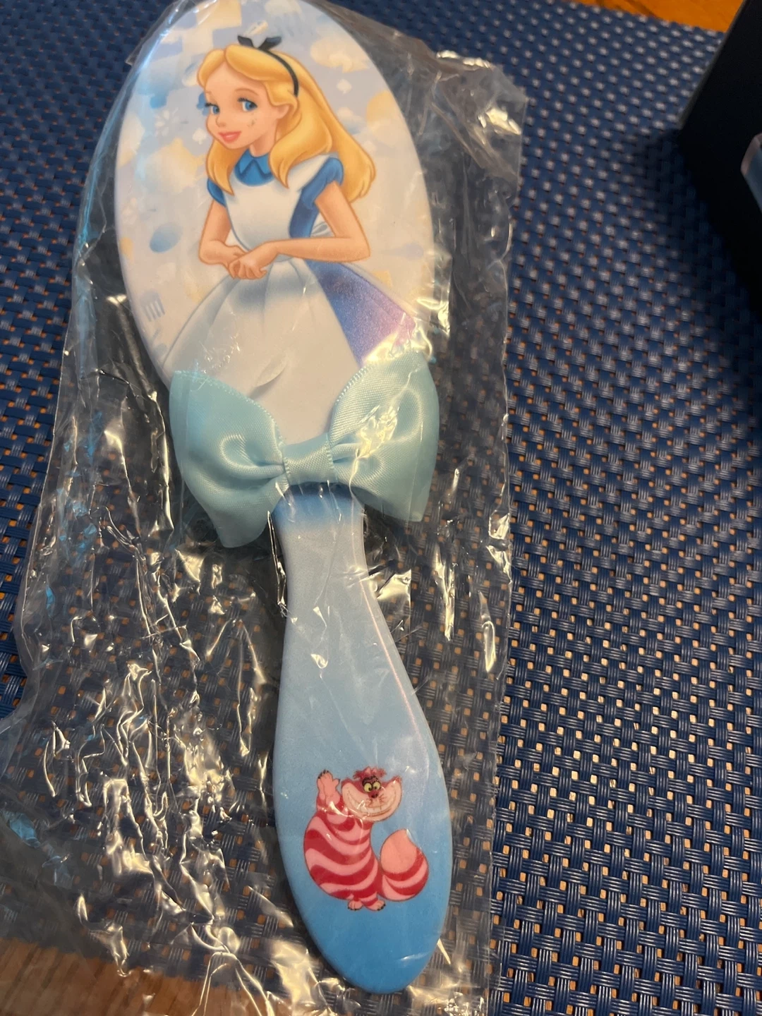 🎁This Alice in Wonderland themed hair brush features Alice and the Cheshire Cat. It has a blue handle and a light blue paddle brush head with blue-tipped bristles. A satin bow adds a decorative touch.