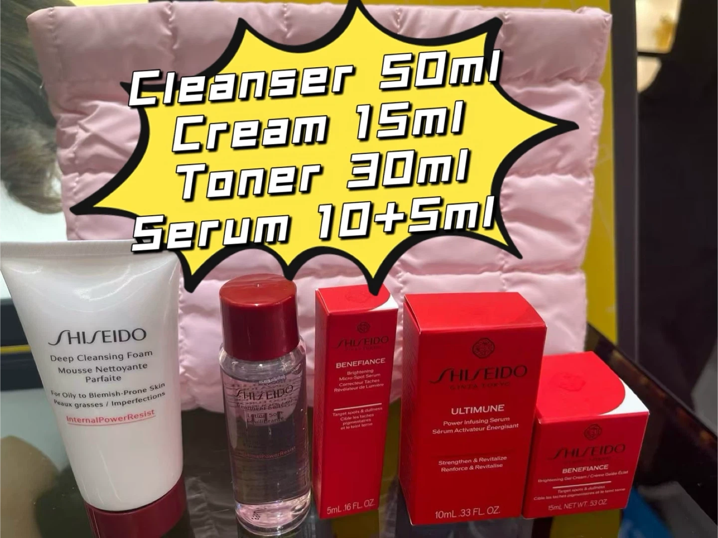 This Shiseido skincare set includes a 50ml Deep Cleansing Foam, 30ml softener, 10ml+5ml Ultimune Power Infusing Serum, and 15ml Benefiance Brightening Gel Cream. It's designed for oily to blemish-prone skin. The set comes with a pink quilted pouch.