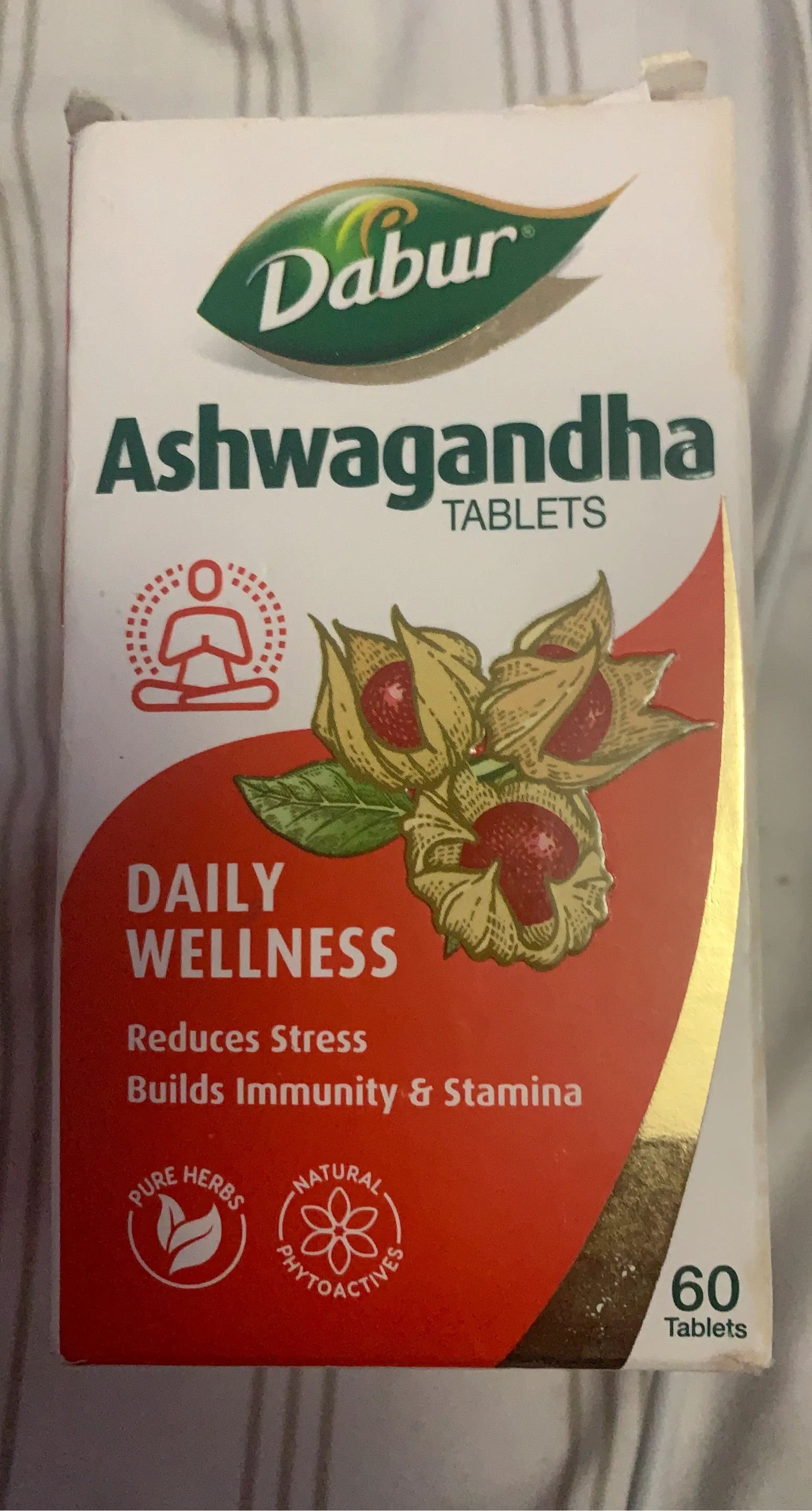 Dabur Ashwagandha Tablets for daily wellness. These tablets help reduce stress and build immunity and stamina. 60 tablets per package. Exp 11/2026