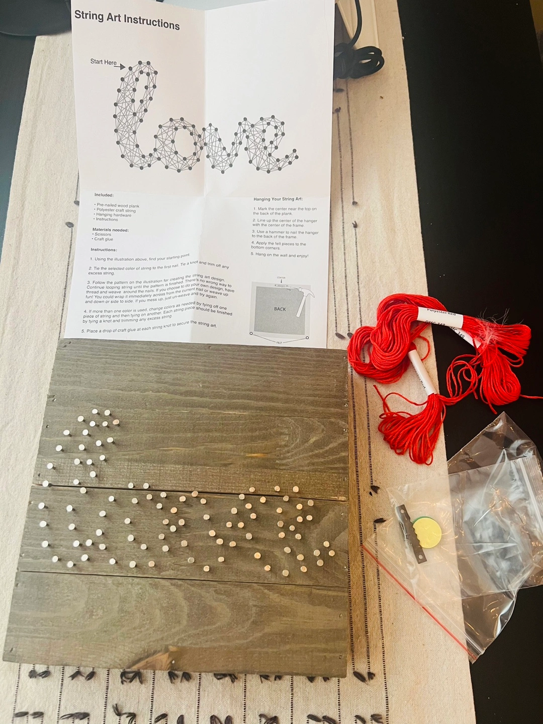 String art kit. Includes pre-nailed wood plank, red polyester string, hanging hardware, and instructions. Create your own LOVE string art for Mother’s Day!