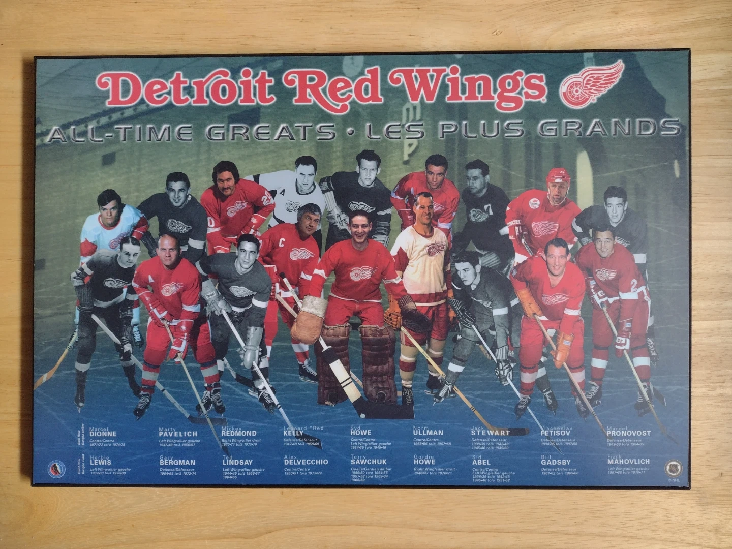 Wooden plaque featuring the Detroit Red Wings All-Time Greats with player names and tenure. It's a collage of legendary players in their iconic jerseys. This piece celebrates the rich history of the team.