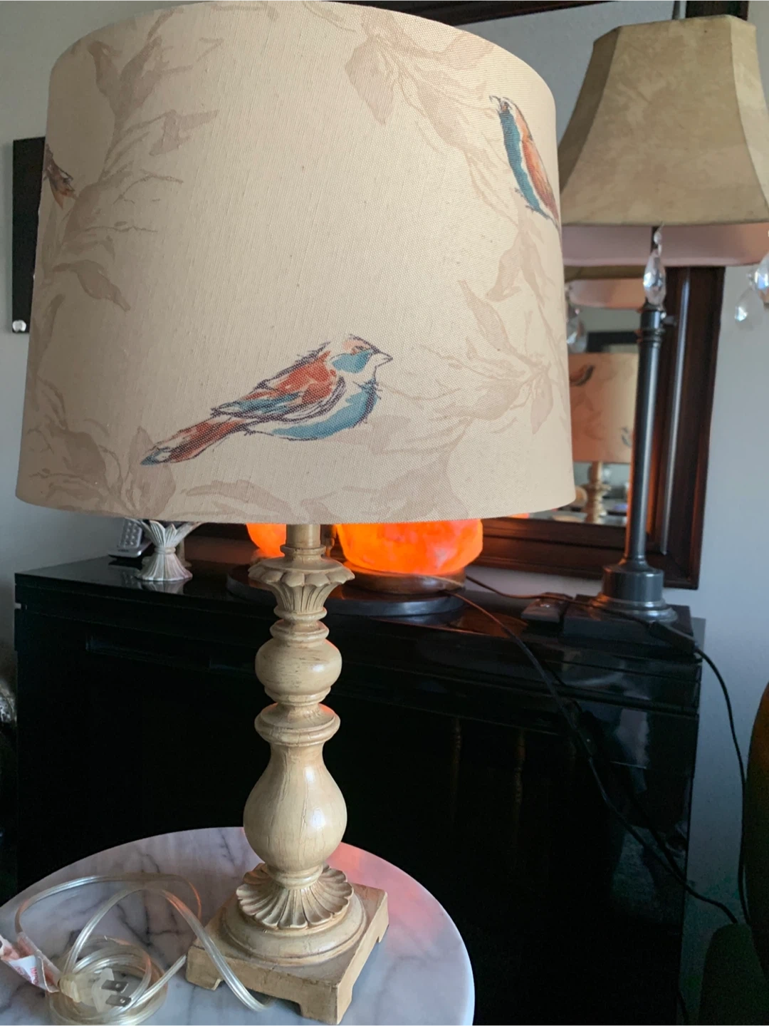 A charming table lamp with a decorative lampshade featuring a bird and floral pattern. Its base has an antique-style distressed finish. This lamp adds a touch of elegance to any room.
