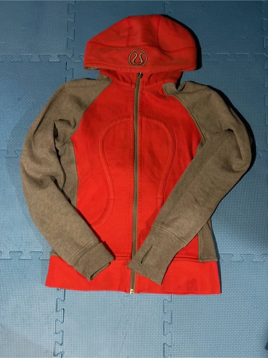 This is a red and grey Lululemon zip-up hoodie. It has thumbholes in the sleeves. It's made of a soft, comfortable material.