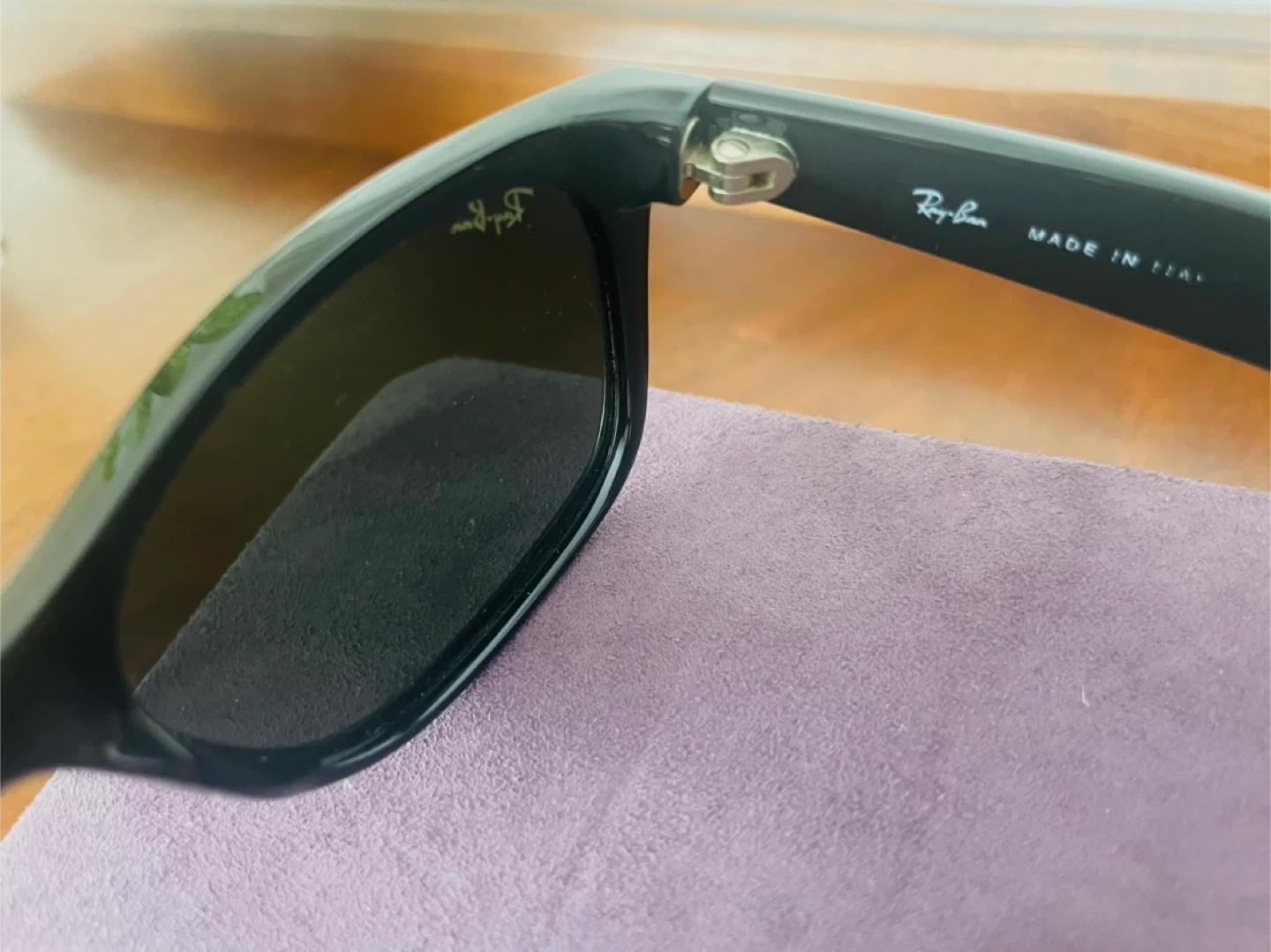 Classic black Ray-Ban Wayfarer sunglasses. These shades are made in Italy and feature a stylish, timeless design. They're perfect for sunny days and adding a touch of cool to any outfit!