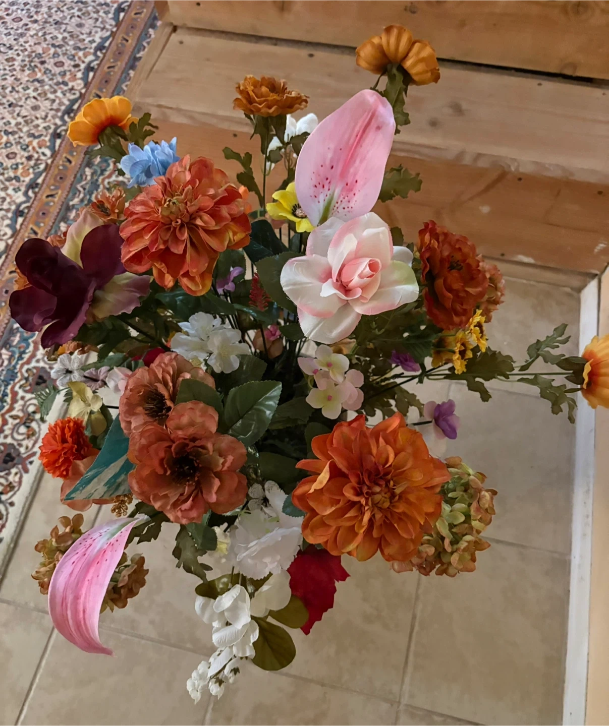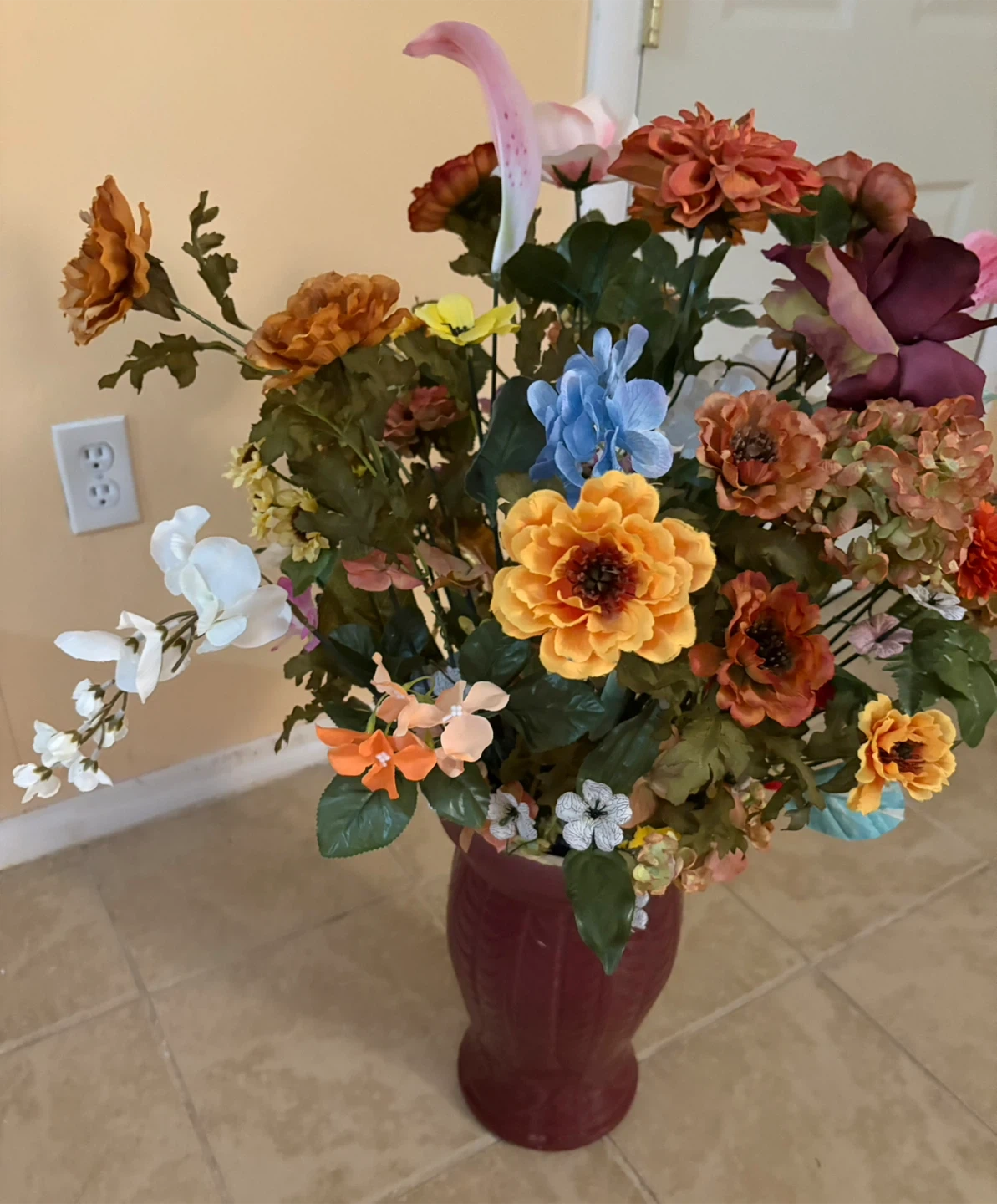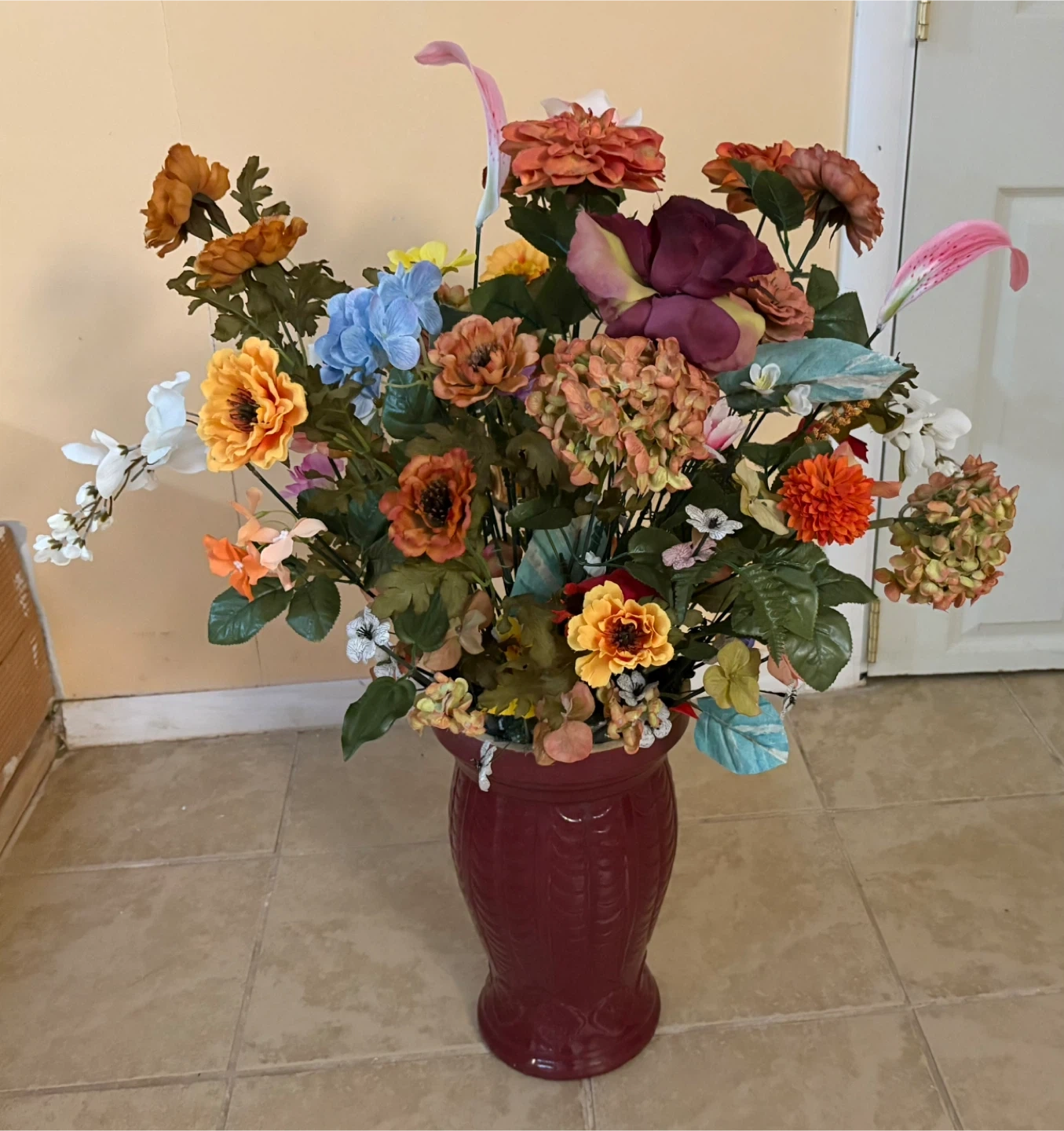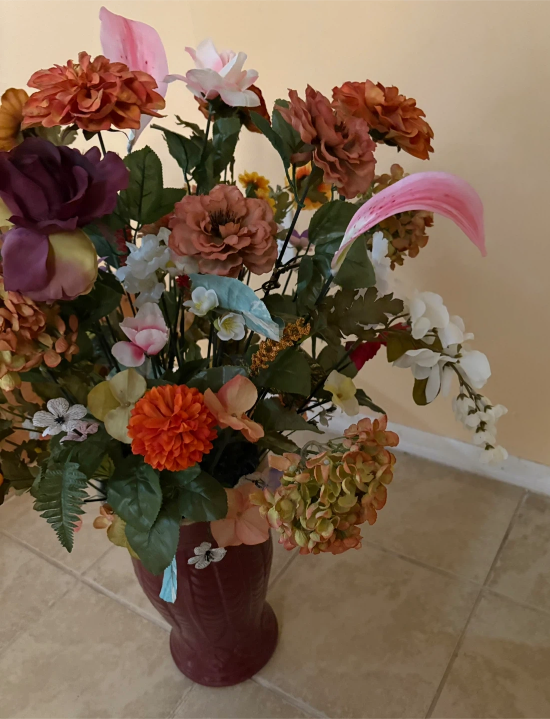 A large artificial floral arrangement featuring a variety of colorful flowers and greenery. It's housed in a decorative burgundy vase. This arrangement adds a vibrant touch to any room! About : 37”