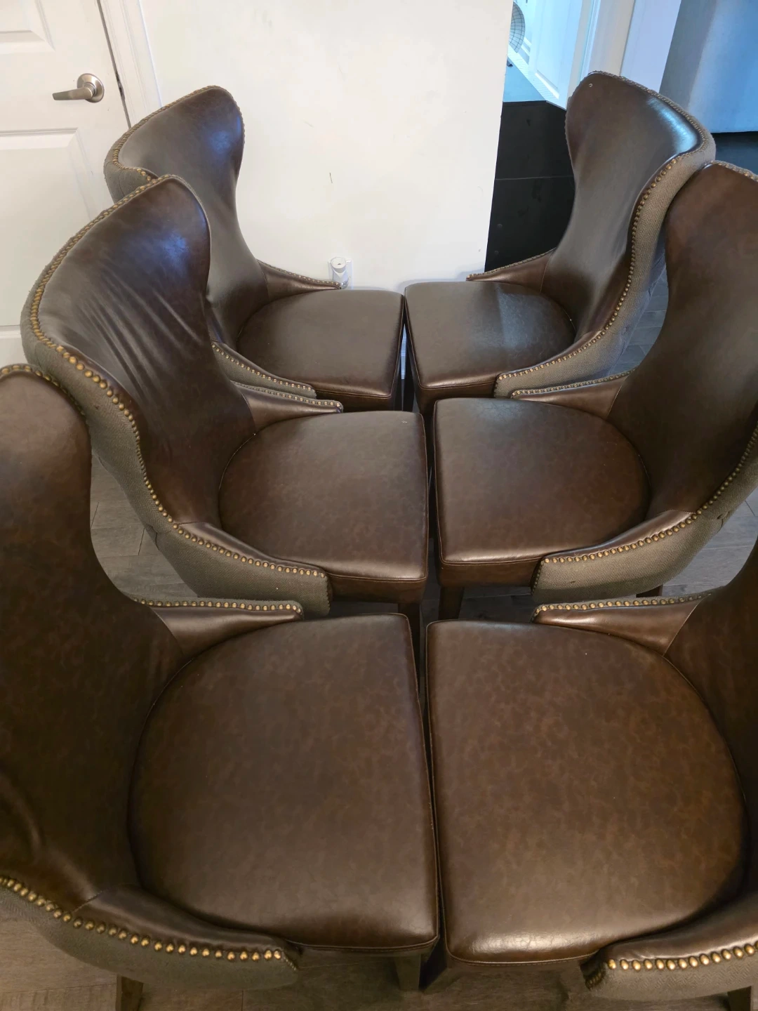 Six dining chairs with rich brown leather upholstery and decorative nailhead trim. They feature a curved back design and sturdy wooden legs.