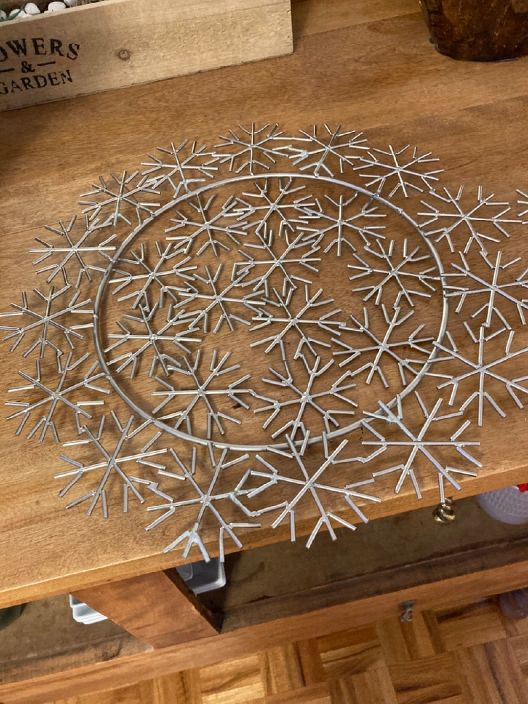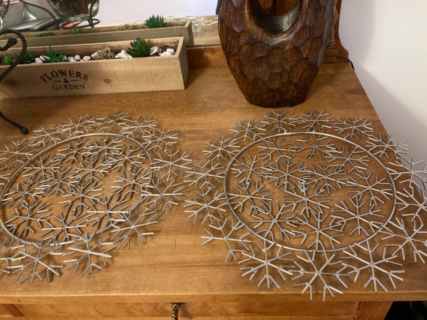 Two circular metal snowflake place settings . Silver coloured metal. Intricate snowflake designs. Perfect for winter decor.