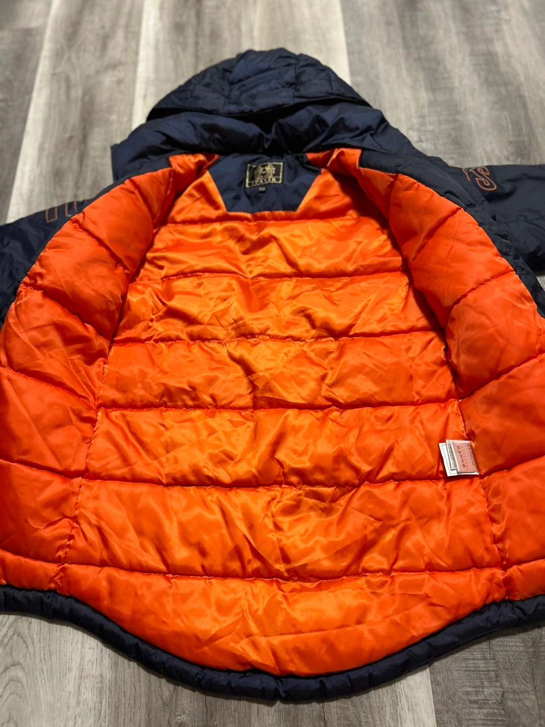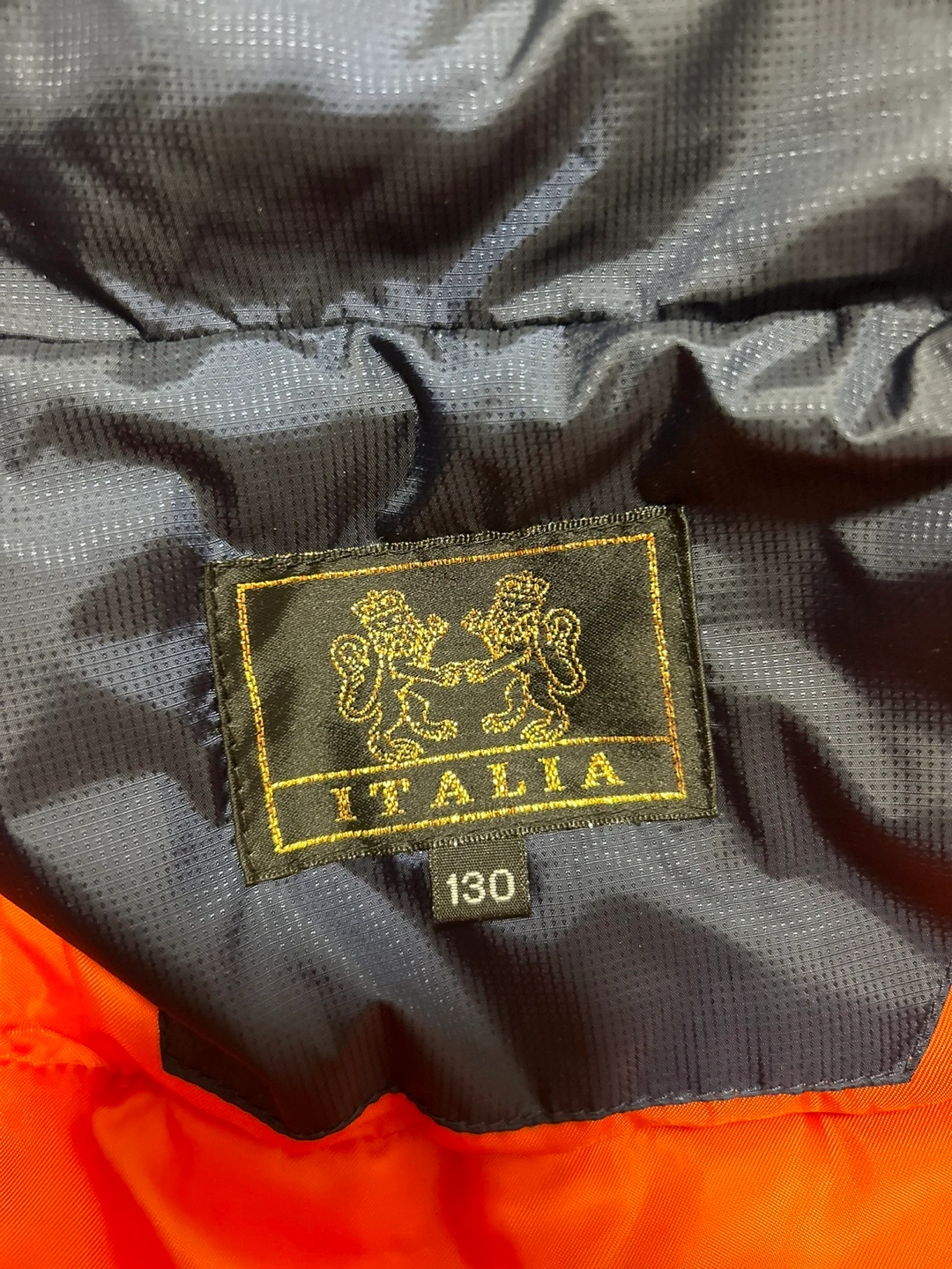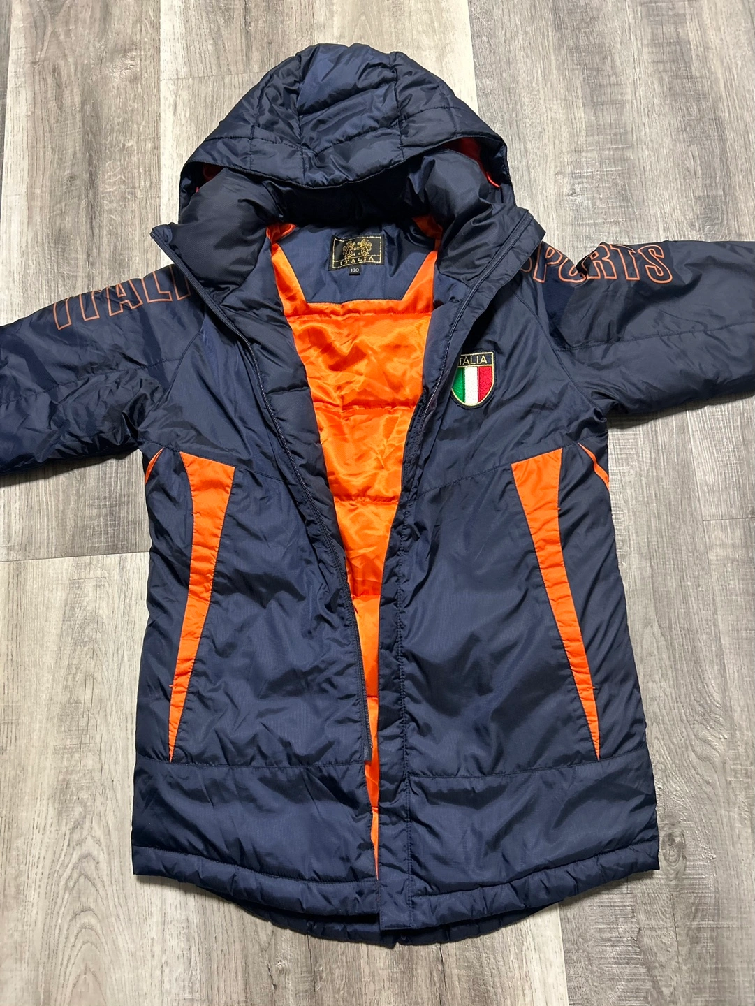 Blue and orange winter jacket with a hood. The jacket has an orange interior lining and an Italian flag patch on the front. The jacket has a zipper closure.