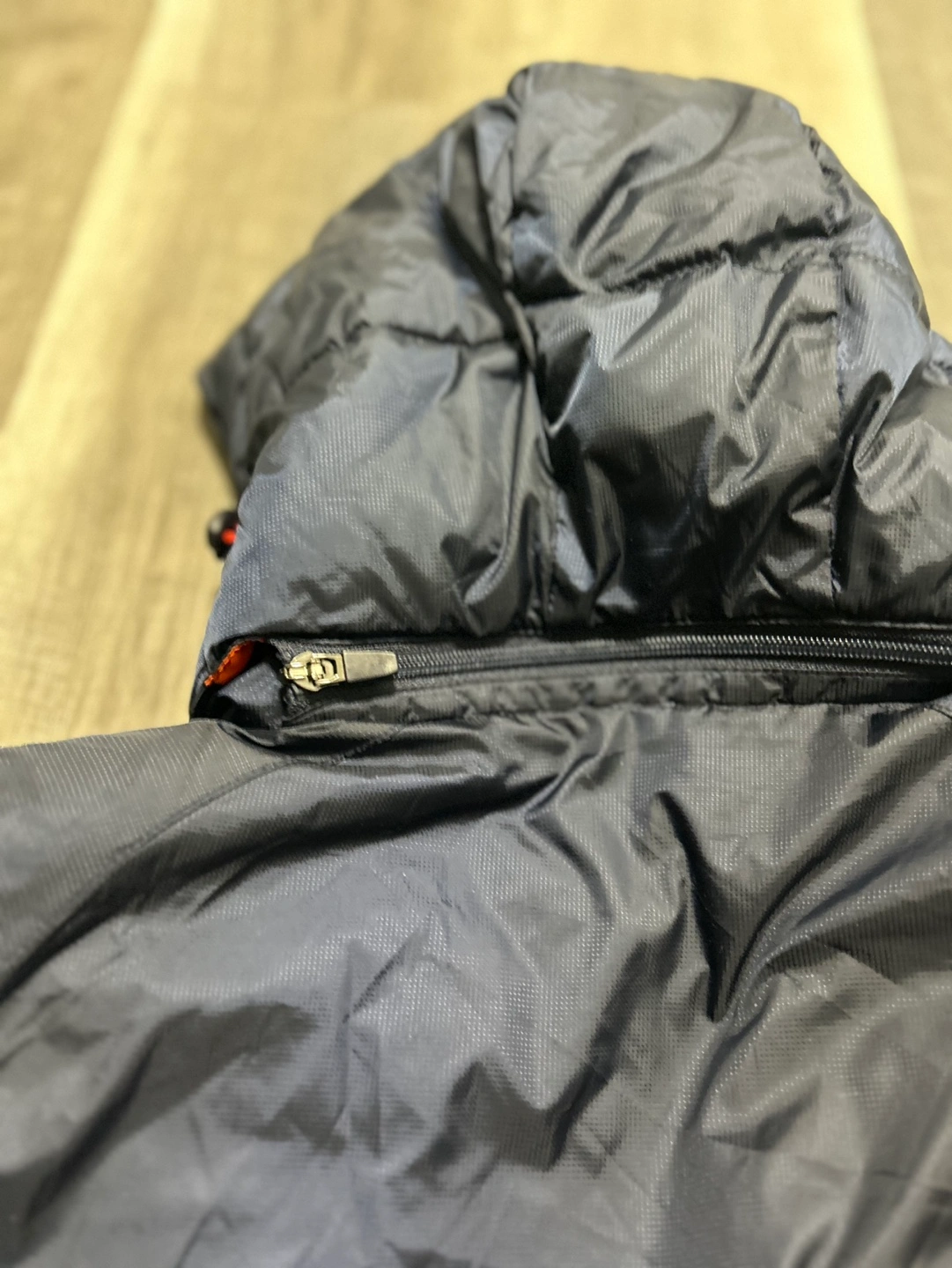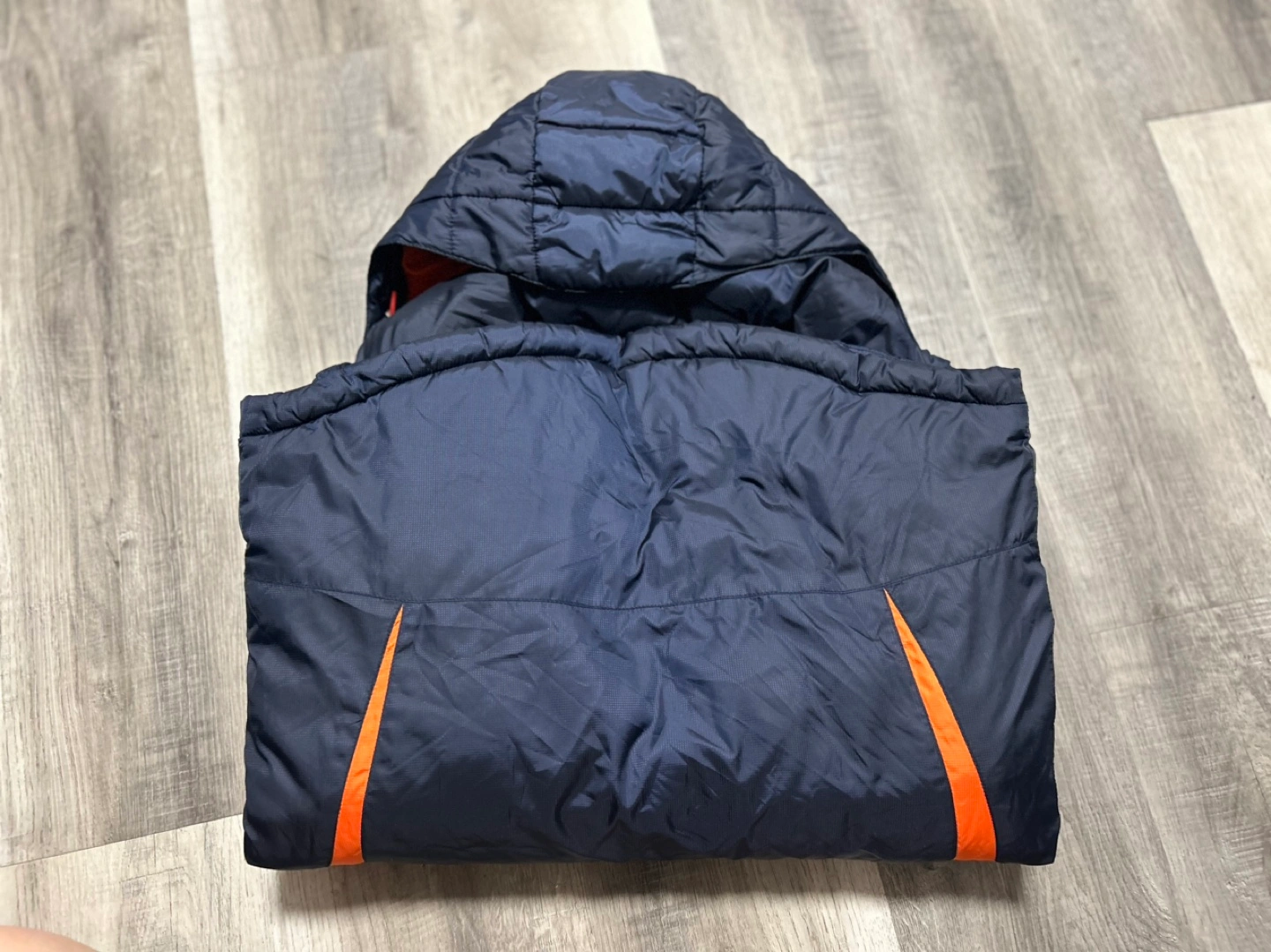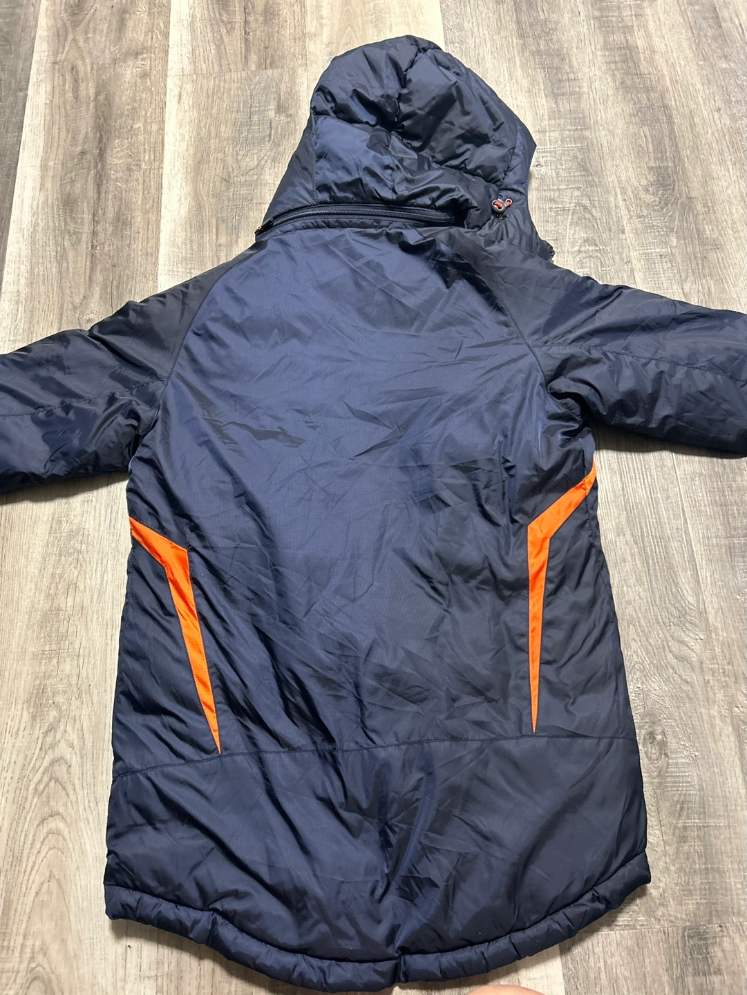 Blue and orange winter jacket with a hood. The jacket has an orange interior lining and an Italian flag patch on the front. The jacket has a zipper closure.